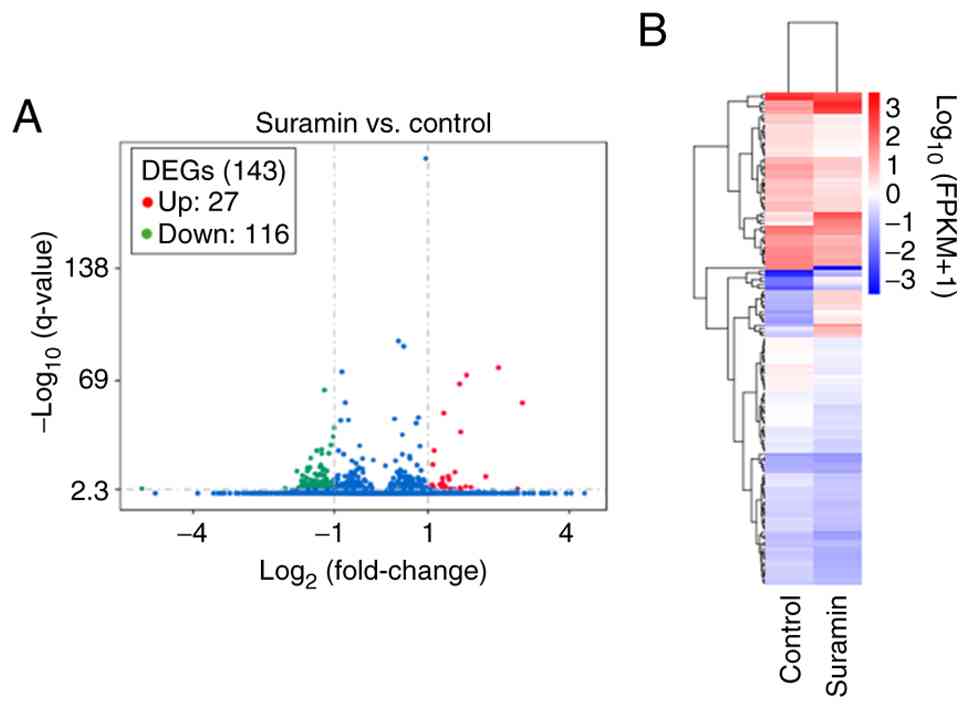 RNA-sequencing detected 60,448 genes, of which 12,114 were commonly expressed in both groups. Differential expression analysis identified 116 downregulated and 27 upregulated genes in suramin-treated cells (Fig. 1A), and cluster analysis showed distinct expression patterns (Fig. 1B). Downregulated genes were dominated by regulators of the G2/M transition and mitotic progression (e.g., CCNB1, CDC20, AURKA), kinetochore and spindle assembly (e.g., CENPF, TPX, TUBB), DNA metabolism (RRM2 and TK1), chromatin regulation (DNMT1), cytokinesis (ANLN), chromosome segregation (MKI67 and TOP2A), nuclear envelope integrity (LMNB1/2), DNA damage response (HMGB1/2 and PCNA), and metabolic regulators (LDHA and PSAT1) were broadly suppressed (Table I).
