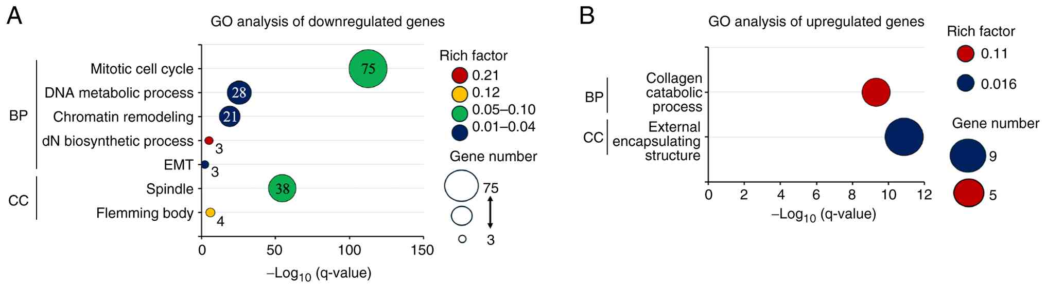 GO enrichment analysis of the downregulated gene set demonstrated significant overrepresentation of mitosis-related pathways, including the mitotic cell cycle, DNA metabolic process, chromatin remodeling, and deoxyribonucleotide biosynthetic process, indicating the coordinated downregulation of genes governing G2/M progression, DNA replication/repair, and chromatin regulation (Fig. 2A). In contrast, the upregulated genes were enriched in extracellular matrix-related processes, such as collagen catabolism, consistent with the activation of ECM remodeling (Fig. 2B).