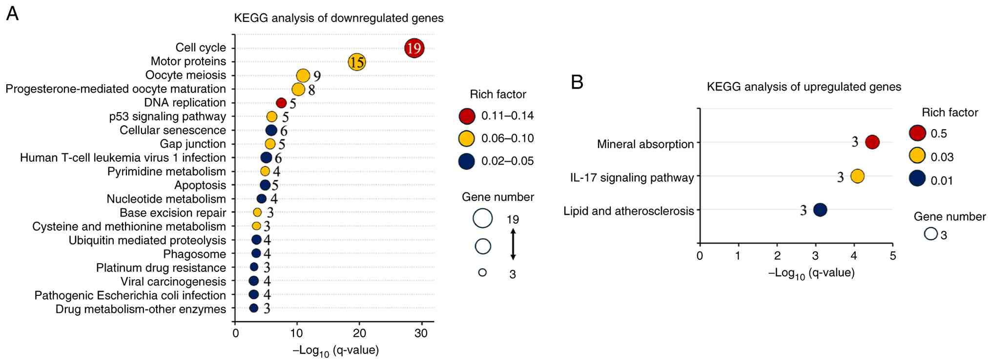The KEGG pathway analysis demonstrated significant enrichment of pathways central to cell proliferation and genome stability in the downregulated gene set. The cell cycle was most prominently enriched, with associated terms involving G2/M transition, spindle assembly, and checkpoint regulation. Additional enrichment in DNA replication, p53 signaling, and base excision repair supports the notion of impaired genome maintenance. Enrichment of cellular senescence, ubiquitin-mediated proteolysis, and apoptosis further indicated perturbation of protein turnover and checkpoint surveillance (Fig. 3A). In contrast, the upregulated genes were enriched in only three pathways, mineral absorption, IL-17 signaling, and lipid and atherosclerosis, suggesting adaptive changes in metal ion homeostasis, immune modulation, and lipid metabolism (Fig. 3B).