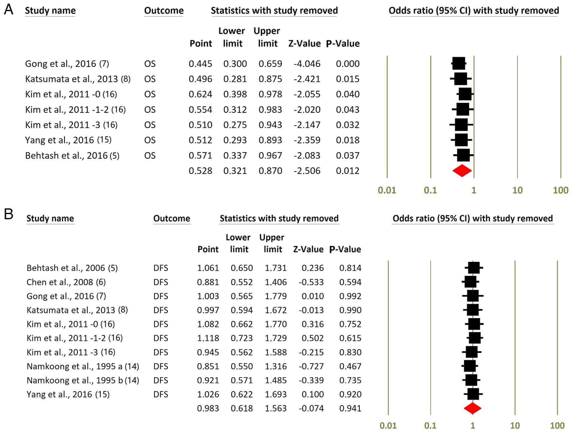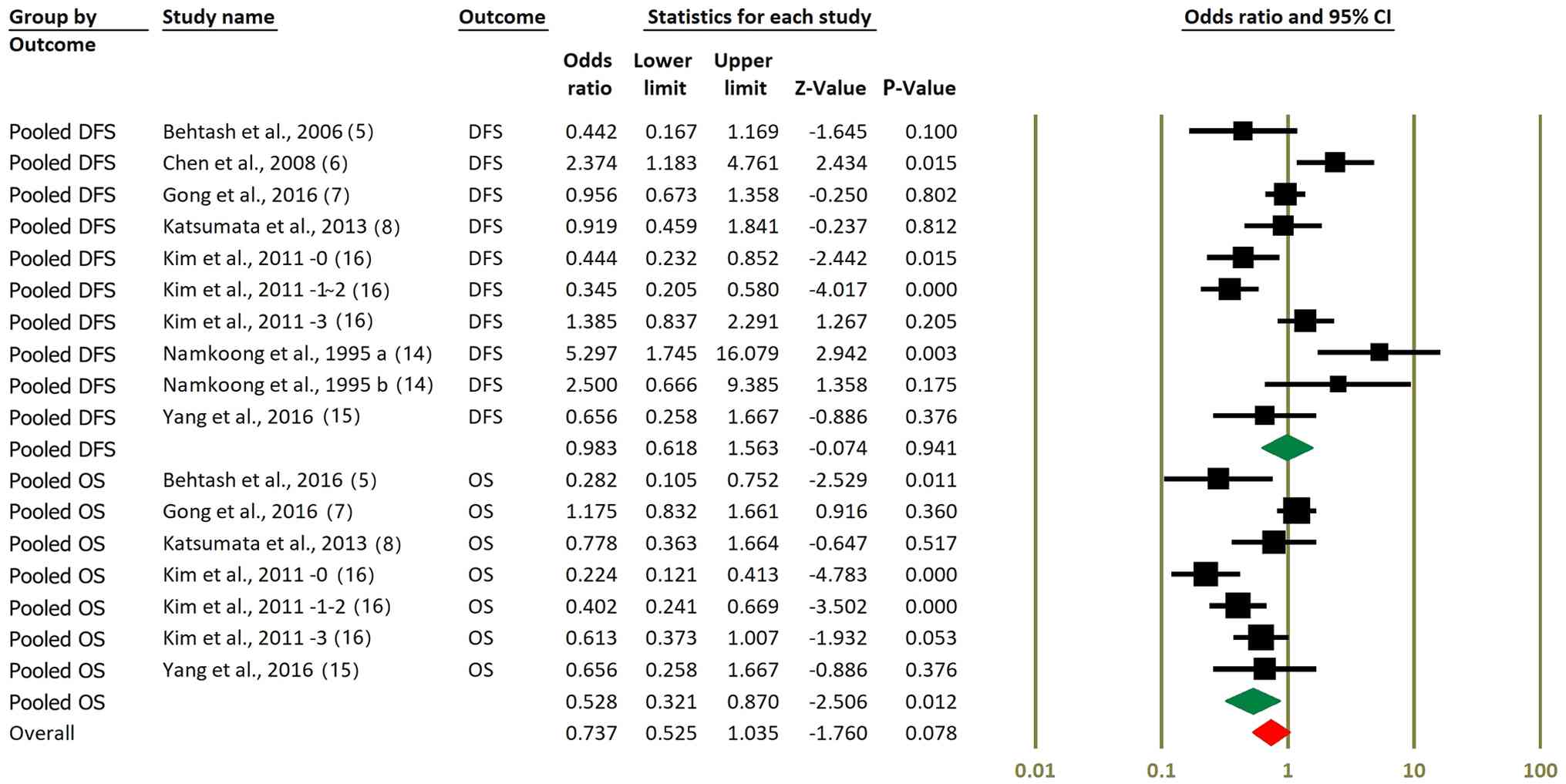 A subgroup-specific meta-analyses was performed based on survival outcome type (OS vs. DFS). Fig. 2 presents the survival outcome-specific meta-analyses for DFS and OS. For DFS, the pooled OR was 0.98 (95% CI, 0.62-1.56; P=0.941), indicating no significant benefit of NACT followed by RS compared with surgery alone. Although several individual studies reported improvements in DFS, these effects did not translate into a significant pooled estimate. By contrast, the pooled analysis of OS data showed a more favorable effect. When restricted to OS outcomes only, the pooled OR was 0.53 (95% CI: 0.32-0.87; P=0.012), suggesting a statistically significant survival benefit associated with NACT. However, when all studies contributing OS and DFS data are combined, the overall effect estimate becomes more modest and borderline significant (OR, 0.74; 95% CI, 0.53-1.04; P=0.078). These findings highlight a potential outcome-specific benefit of NACT for OS but not for DFS.