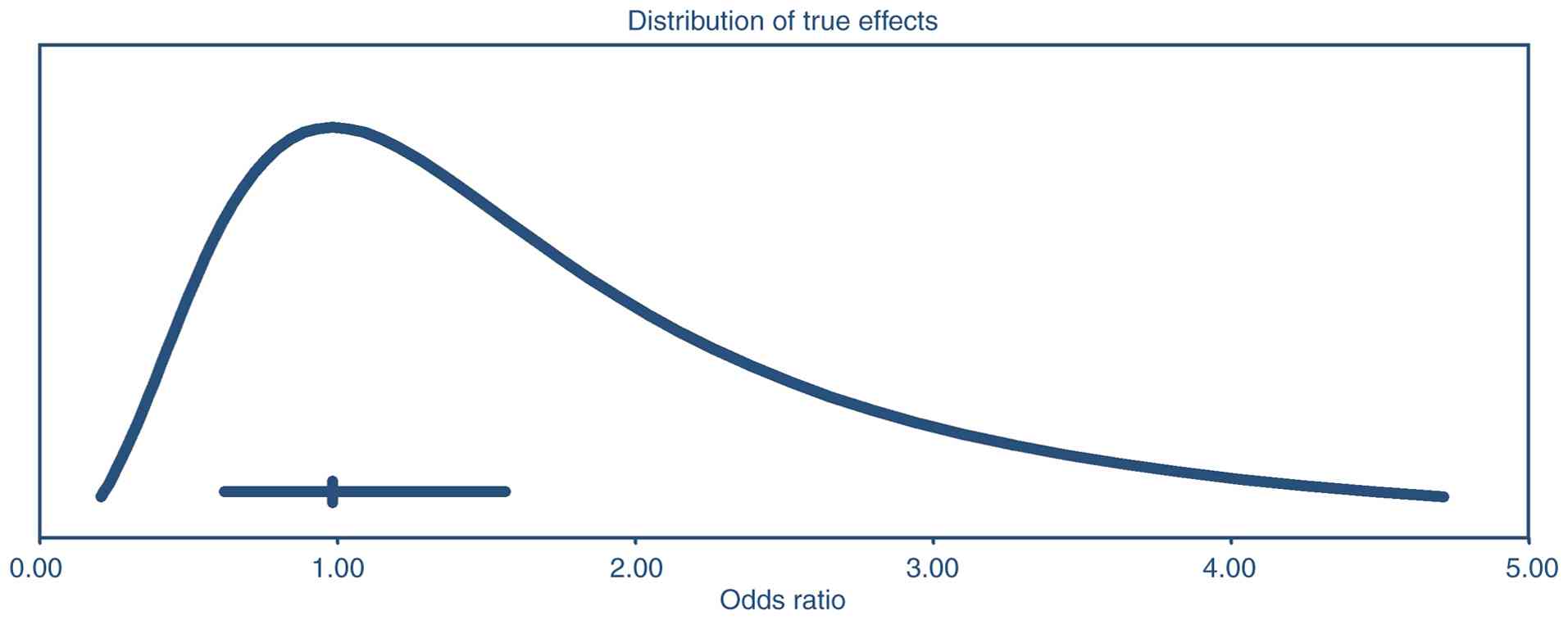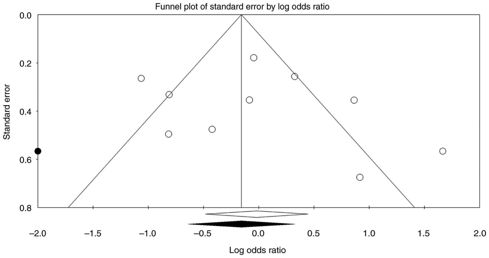 In the leave-one-out sensitivity analysis for OS (Fig. 3A), removing each study one at a time resulted in ORs ranging from 0.45 to 0.62, all with statistically significant P-values of <0.05. The combined estimate remains significant (OR, 0.53; 95% CI, 0.32-0.87, P=0.012), indicating that no single trial primarily drives the benefit in OS. By contrast, for DFS (Fig. 3B), excluding individual studies yields summary ORs consistently near 1.0, with P-values from 0.467 to 0.990, highlighting the lack of a significant overall effect on DFS and confirming that the null finding is robust against the omission of any single study. The funnel plot of log ORs against standard error appears fairly symmetrical, suggesting no major signs of publication bias (Fig. 4). Begg and Mazumdar's rank correlation produces Kendall's τ values near 0.2 with non-significant P-values (two-tailed P>0.4), while Egger's regression test also shows no evidence of small-study effects (P>0.5). Duval and Tweedie's trim-and-fill analysis detects no missing studies on either side of the mean, leaving the pooled estimate unchanged. The fail-safe N similarly indicates that no additional studies are needed to bring the meta-analysis to a non-significant level. Overall, these findings suggest that the observed effect estimates are not heavily influenced by publication bias. The prediction-interval analysis (Fig. 5) indicates that, although the average effect size (OR, 0.98) has a 95% CI of 0.62-1.56 implying no clear departure from unity; the true effect across similar populations could range widely, from about 0.21 to 4.71. Therefore, even though the pooled estimate does not significantly differ from no effect, there is substantial heterogeneity; some settings might observe smaller effects (possibly null or worse), while others could see much larger effects.