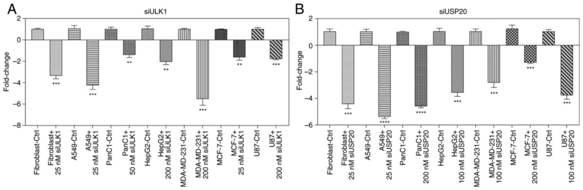 In HepG2 cells treated with doxorubicin, knocking down ULK1 and USP20 significantly re-sensitized the cells to the drug, with IC50 of 0.09 and 0.17 µM, respectively, when compared with doxorubicin-treated HepG2 cells (IC50=0.28 µM). PanC1 cells treated with gemcitabine displayed a similar pattern, becoming more sensitive to the drug; however, the effect of ULK1 inhibition was minimal and statistically insignificant (P=0.053). A549 cells treated with cisplatin revealed more aggressive behavior when ULK1 was inhibited, but those cells were slightly re-sensitized to the drug when USP20 was inhibited. The response of glioblastoma U87 cells to siULK1 and siUSP20 was similar; the cells became more aggressive and resistant to doxorubicin with both knockdowns. Overall, the present findings suggested that selectively inhibiting either USP20 or ULK1 could help re-sensitize cancer cells to standard chemotherapy in different cancer types. Thus, inhibiting USP20 or ULK1 may be beneficial for some cancer types, but it should be avoided for others to improve therapy effectiveness.