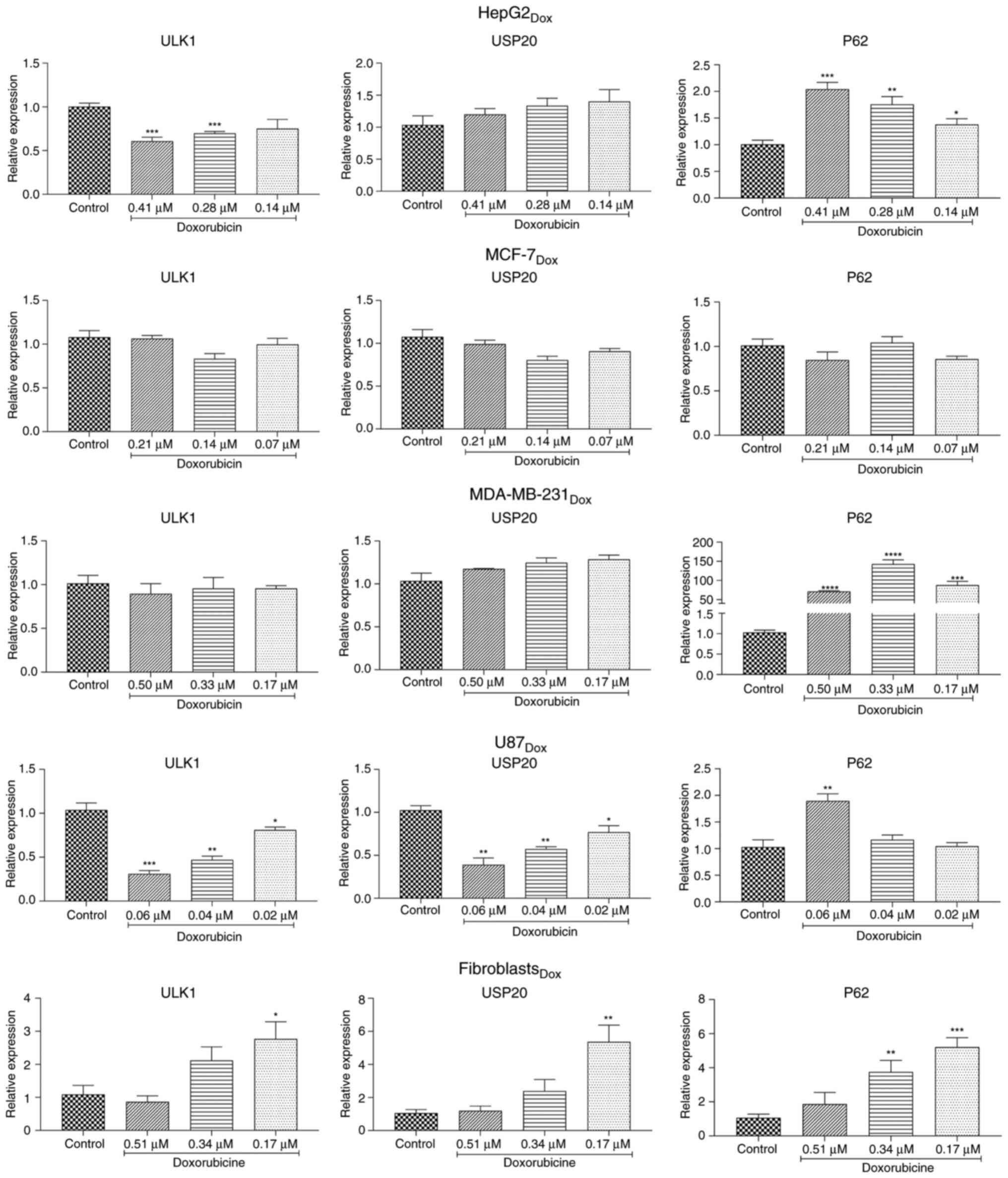 To determine whether traditional chemotherapeutic drugs involve autophagy or other mechanisms, the effect of these agents on the basal levels of autophagy-related genes in different cancer types was assessed. A total of 3 different concentrations of each drug were selected in these experiments, based on the IC50 values reported in Table IV. For this purpose, changes in the expression of three autophagy-related genes: ULK1, USP20 and P62 were investigated. As demonstrated in Fig. 3, in HepG2 cells, doxorubicin reduced ULK1 expression in a dose-dependent manner, while P62 expression was increased in a dose-dependent manner. The drug did not significantly affect USP20 expression in HepG2 cells. U87 exhibited a similar response, but the changes were more pronounced. USP20 was also decreased in these cells in a dose-dependent manner. These results suggest that doxorubicin inhibits autophagy flow in these cells to some extent.