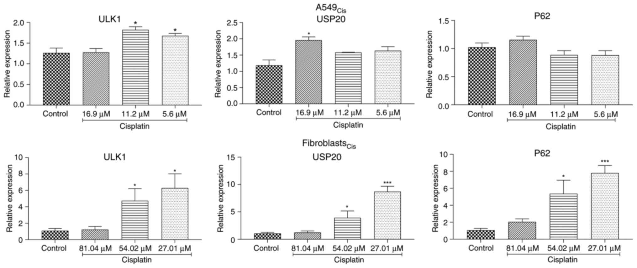 In A549 cells, the highest cisplatin concentration significantly raised USP20 mRNA levels without affecting the autophagy-related genes ULK1 and P62 (Fig. 4A-C). Lower concentrations of cisplatin increased ULK1 mRNA levels but did not have a significant impact on USP20 and P62 mRNA levels. The maximum concentration of cisplatin did not significantly change mRNA levels in fibroblast cells (Fig. 4D-F). However, fibroblasts showed an increase in mRNA levels of all three examined genes with lower concentrations of cisplatin.