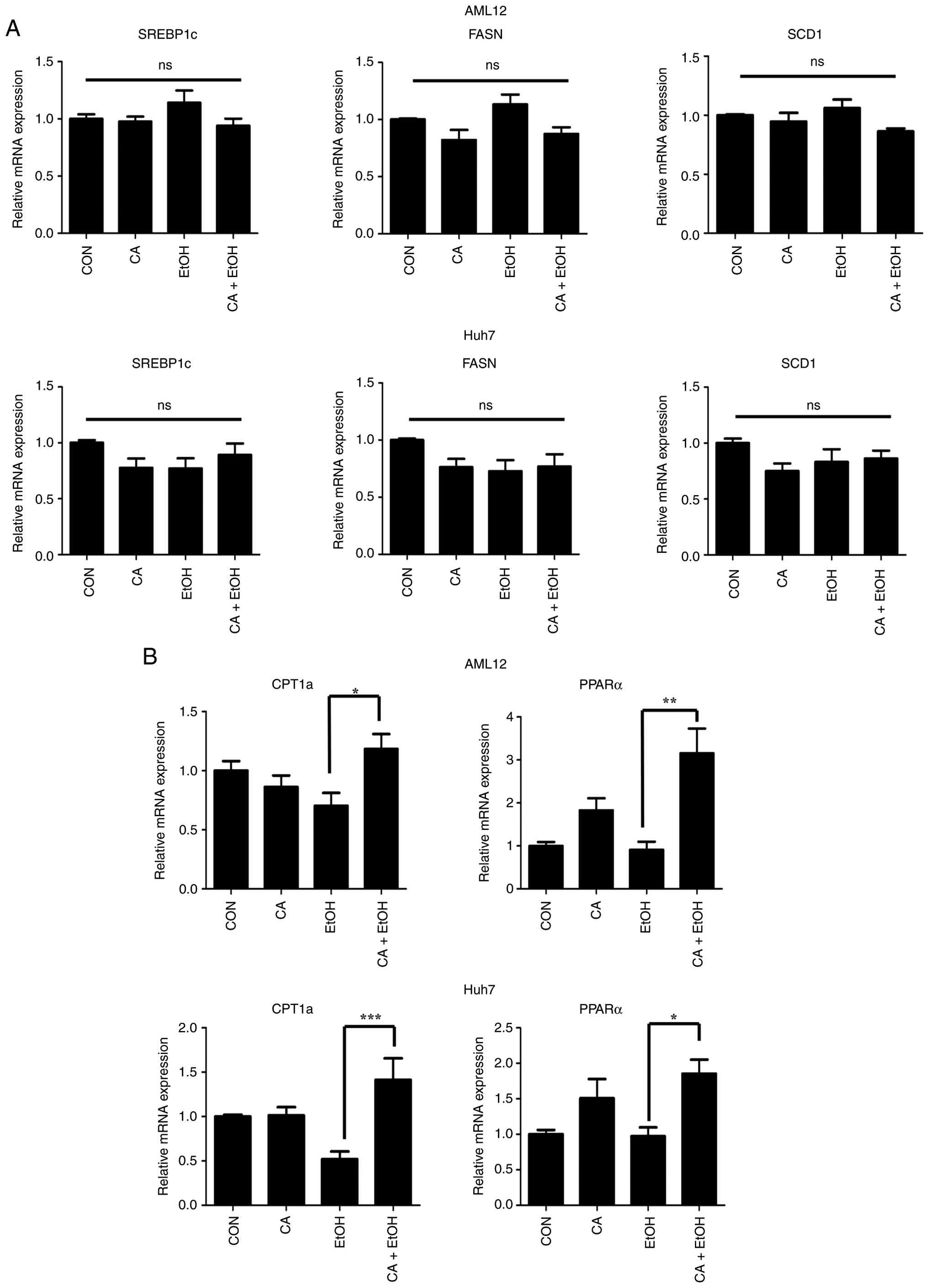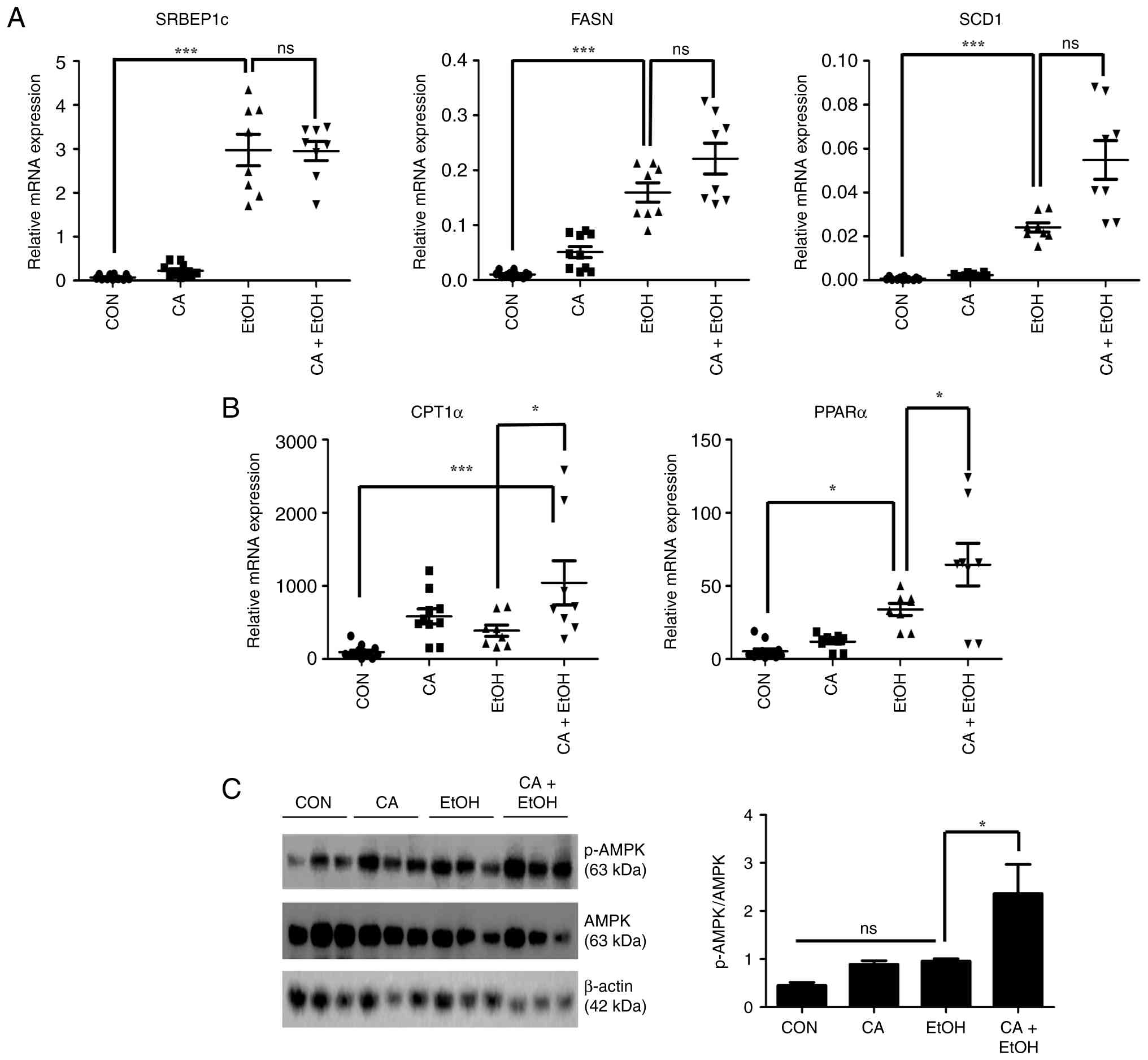 In contrast, co-treatment with CA and EtOH significantly upregulated the expression of β-oxidation-related genes, including carnitine palmitoyltransferase 1A (CPT1a) and PPARα, compared with that of EtOH treatment alone (Fig. 2B). These findings show that CA ameliorated EtOH-induced lipid accumulation by promoting fatty acid oxidation. In addition, AICAR, used as a positive control, increased AMPK phosphorylation in EtOH-treated hepatocytes, and CA similarly elevated p-AMPK levels (Fig. S2), supporting involvement of AMPK signaling in CA-induced upregulation of β-oxidation under EtOH exposure.