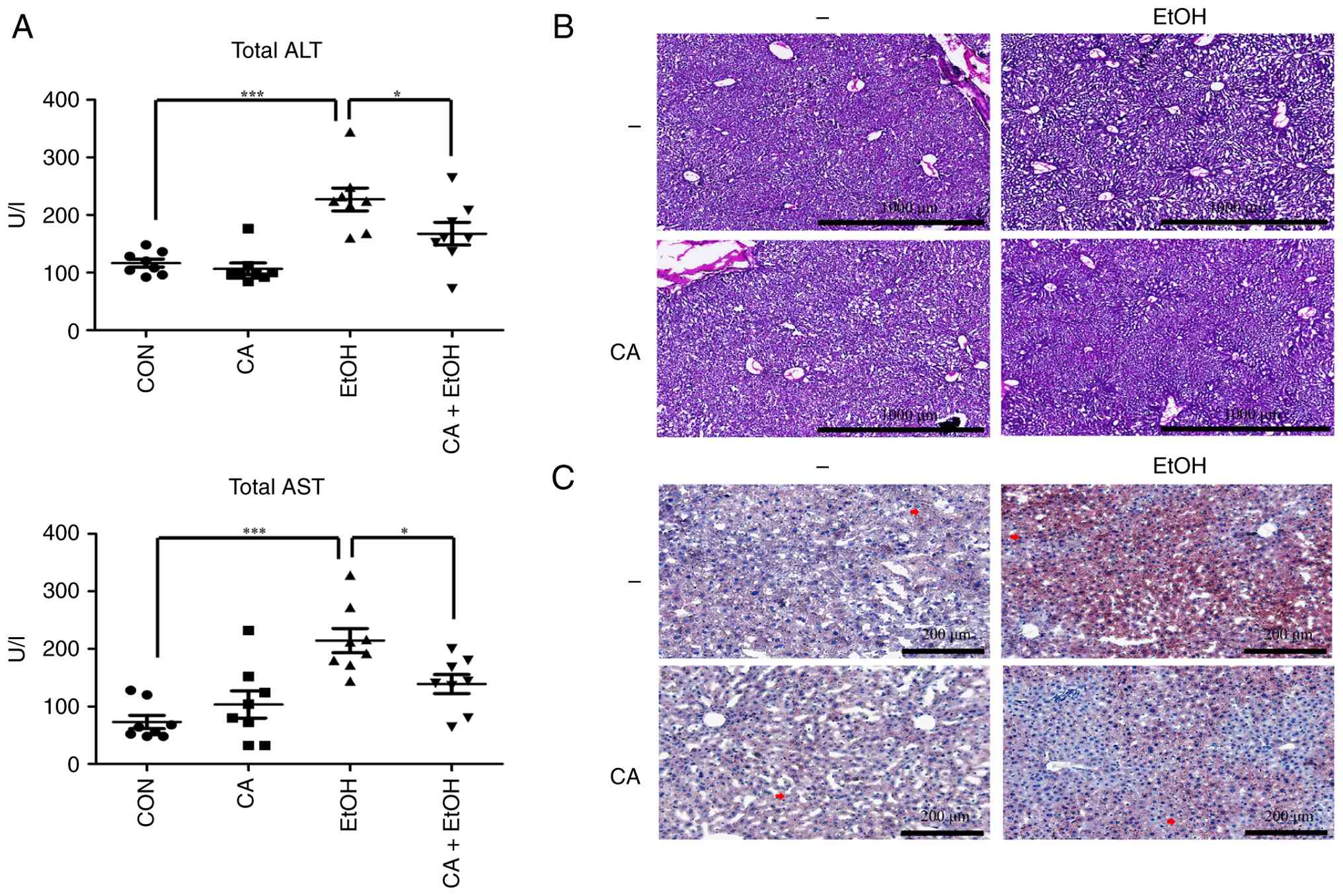Importantly, our in vivo data showed that the serum levels of the liver injury markers ALT and AST were increased by EtOH exposure, and this increase was significantly attenuated by CA administration, although histological evidence of liver damage was not observed at the EtOH dose used. Considering that ALT and AST serum levels are used as sensitive early indicators of liver injury (24), even though histological changes were not evident, these altered serum levels suggest that CA has the potential to alleviate early-stage liver damage, highlighting its potential role in supporting liver health during early EtOH-induced stress.