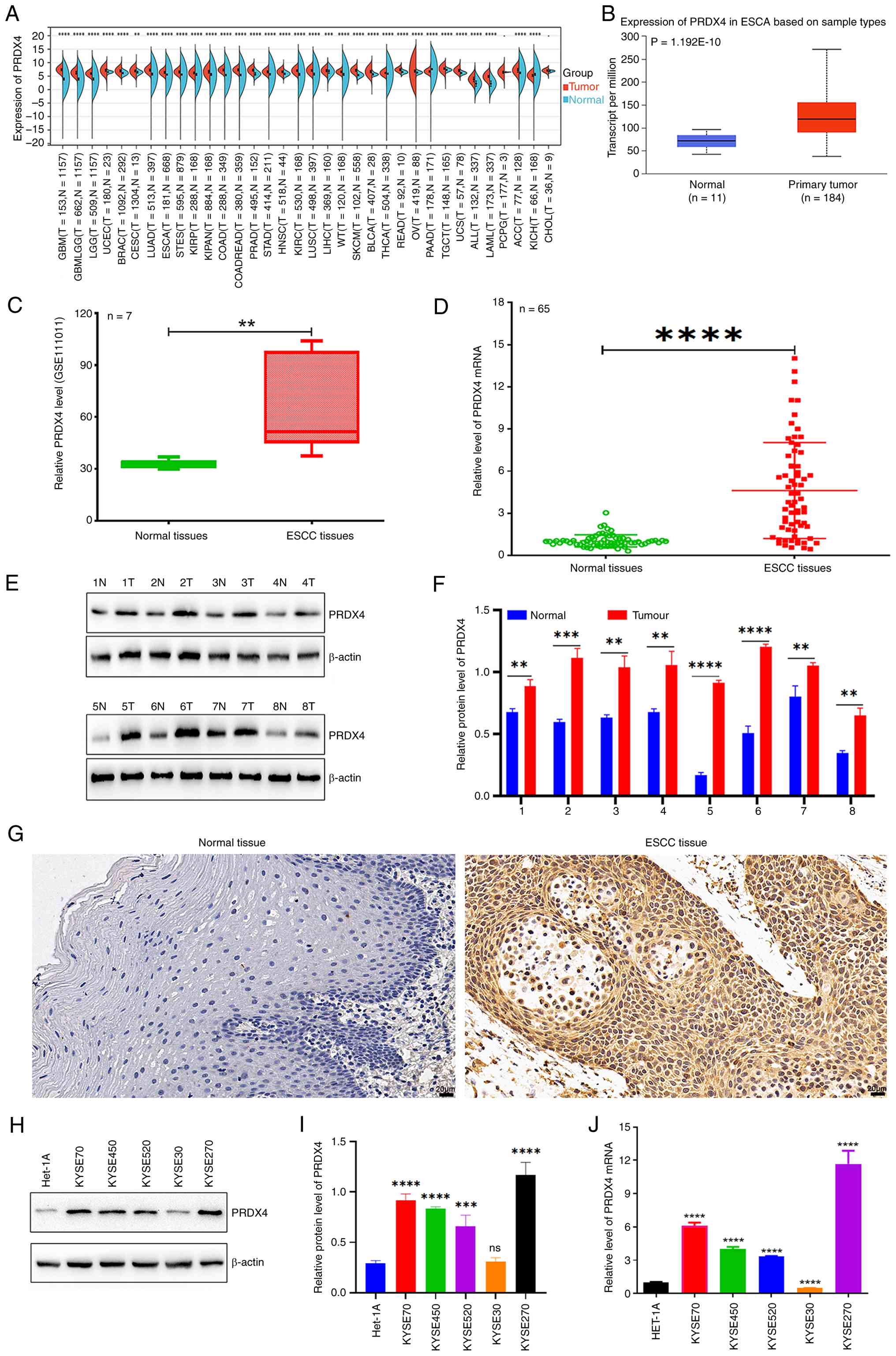 Peroxiredoxins (PRDXs) constitute a family of peroxidase enzymes (PRDX1-6) characterized by a catalytic cysteine residue embedded within the evolutionarily conserved motif PXXXTXXC (6-8). From a functional perspective, the six mammalian peroxiredoxins (PRDX1-6) exhibit distinct characteristics in terms of subcellular localization, susceptibility to hyperoxidation, substrate specificity, and the presence or absence of an additional resolving cysteine residue (9,10). Several studies have demonstrated that PRDX4, a major factor of redox balance, shields cells from reactive oxygen species (ROS)-induced oxidative damage by diminishing peroxides, such as hydrogen peroxide (H2O2) (11,12). Elevated ROS levels have been implicated in the pathological and physiological processes of a broad range of diseases, such as cancer and neurodegenerative disorders (13,14). In addition, tumor cells often experience oxidative stress due to increased ROS levels (15), which in turn results in damaged biomacromolecules (lipids, proteins, and DNA), thus triggering strong cell toxicity (16). Wang et al (17) found that PRDX4 knockdown elicited ROS overproduction in hepatocellular carcinoma (17). PRDX4 has been widely reported to participate in the development and progression of various tumors, such as breast cancer (18), hepatoblastoma (19), renal cell carcinoma (20), uterine corpus endometrial carcinoma (21), pancreatic ductal adenocarcinoma (22), and gastric cancer (23). Moreover, PRDX4 has been developed as a biomarker and a novel therapeutic target for renal papillary cell carcinoma and pancreatic cancer (24). These studies suggest that targeting PRDX4 may be an attractive therapeutic strategy for a variety of tumors. However, whether PRDX4-mediated tumor-promoting effects make it an attractive target for patients with ESCC remains to be investigated.
