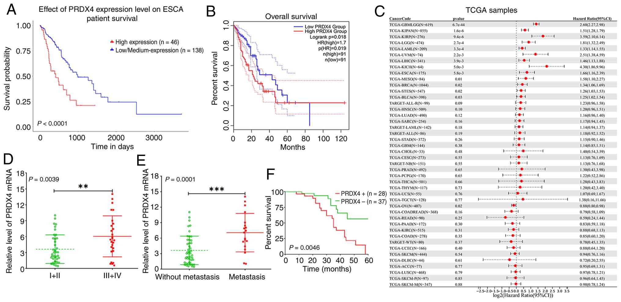 PRDX4 expression and pan-cancer prognostic values were analyzed using the Sangerbox 3.0 online database (http://vip.sangerbox.com/home.html). PRDX4 expression in ESCA and its association with patient survival was investigated using the UALCAN online database (http://ualcan.path.uab.edu/). The effect of PRDX4 on the overall survival of patients with ESCA was analyzed using the online databases, UALCAN and GEPIA (http://gepia.cancer-pku.cn/). GSE111011 was downloaded from the GEO database (https://www.ncbi.nlm.nih.gov/geo/query/acc.cgi?acc=GSE111011) for PRDX4 expression assay.