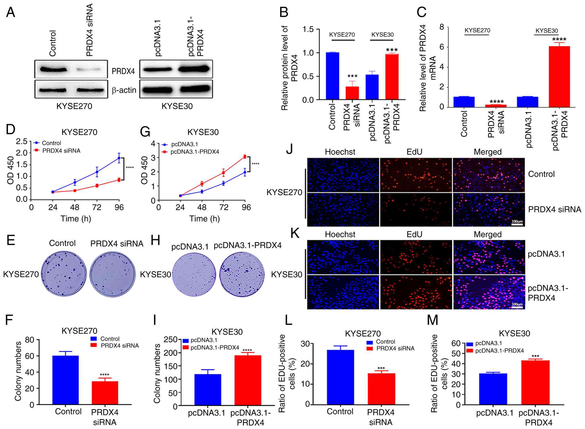 To further explore the biological role of PRDX4 in ESCC, ESCC cells were transfected with PRDX4 siRNA and the overexpression vector pcDNA3.1-PRDX4. PRDX4 siRNA significantly downregulated PRDX4 expression in KYSE520 cells with high PRDX4 expression (Fig. 3A and B), whereas pcDNA3.1-PRDX4 markedly upregulated PRDX4 expression in KYSE30 cells with low PRDX4 expression (Fig. 3A and B), which was further validated using RT-qPCR (Fig. 3C). Further investigation indicated that PRDX4 depletion inhibited cell proliferation and colony formation (Fig. 3D-F), whereas PRDX4 overexpression had the opposite effects (Fig. 3G-I). Furthermore, EdU staining revealed that PRDX4 downregulation markedly reduced the number of EdU-positive cells, whereas PRDX4 overexpression markedly increased the number of EdU-positive cells (Fig. 3J-M). These findings indicated that PRDX4 functions as an oncogene in ESCC cells.