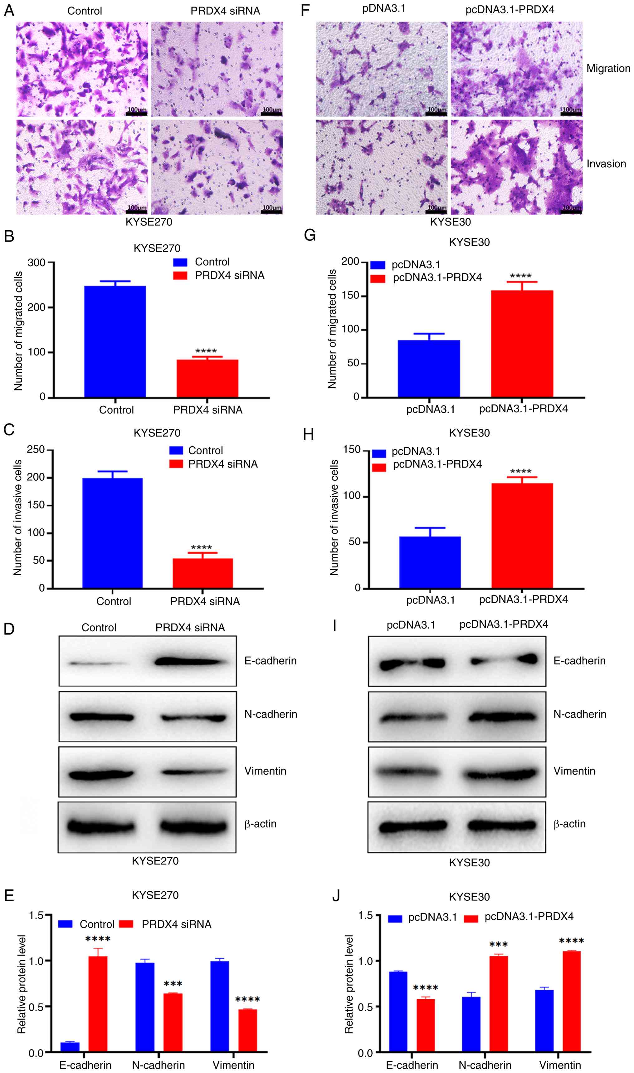 In the present study, the role of PRDX4 in ESCC cell migration and invasion was explored. The results revealed that PRDX4 downregulation markedly suppressed ESCC cell migration and invasion (Fig. 4A-C). Western blot analysis demonstrated that PRDX4 knockdown markedly promoted the expression of E-cadherin, but reduced the expression of N-cadherin and vimentin (Fig. 4D and E). Conversely, PRDX4 overexpression significantly increased the migration and invasion abilities of ESCC cells (Fig. 4F-H), reduced E-cadherin expression, and increased N-cadherin and vimentin expression (Fig. 4I and J). These findings indicated that PRDX4 is an important regulator of ESCC cell invasion.