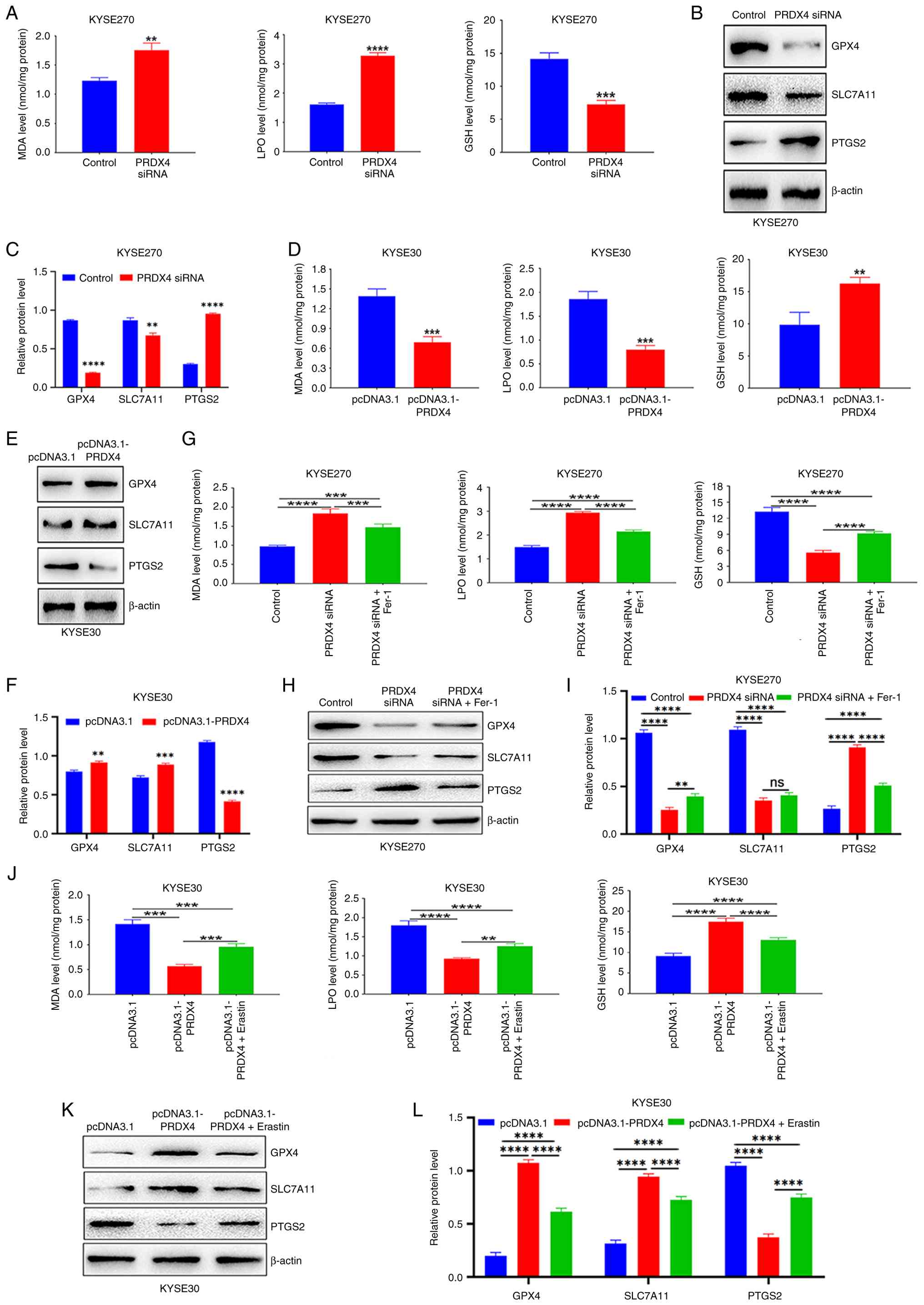 Considering the important role of PRDX4 in oxidative stress, it was investigated whether PRDX4 affected ferroptosis in ESCC cells. It was revealed that PRDX4 depletion increased the levels of MDA and LPO but reduced the levels of GSH in ESCC cells (Fig. 5A). Furthermore, western blotting revealed that PRDX4 knockdown reduced the expression of ferroptosis inhibitory factors, such as GPX4 and SLC7A11, but increased the levels of the ferroptosis-promoting factor, PTGS2 (Fig. 5B and C). By contrast, PRDX4 overexpression significantly reduced the levels of MDA and LPO, but increased the levels of GSH in ESCC cells (Fig. 5D), accompanied by enhanced GPX4 and SLC7A11 levels and decreased PTGS2 levels (Fig. 5E and F). Notably, Fer-1 partly reversed the changes in the levels of MDA, LPO, and GSH, as well as the expression of GPX4, SLC7A11, and PTGS2 proteins induced by PRDX4 siRNA in KYSE270 cells (Fig. 5G-I). Similarly, erastin effectively induced ferroptosis, which was suppressed by PRDX4 overexpression in KYSE30 cells, coupled with alterations in the levels of key ferroptosis-related proteins, such as GPX4, SLC7A11, and PTGS2 (Fig. 5J-L). These findings indicated that PRDX4 may participate in the regulation of ferroptosis in ESCC cells.