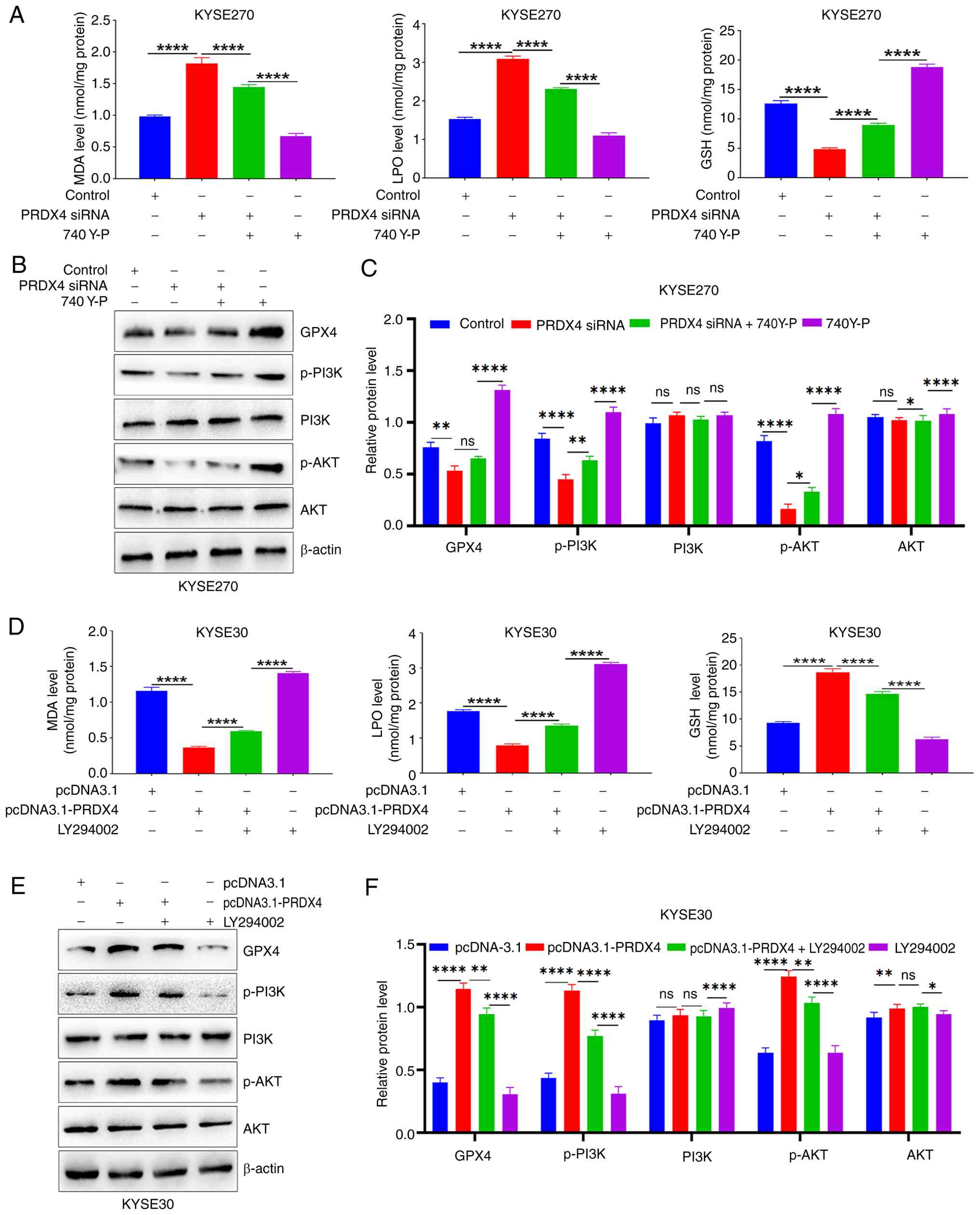 To further elucidate the potential molecular mechanisms of PRDX4 in the regulation of ferroptosis, the effects of PRDX4 on the PI3K/AKT signaling pathway in ESCC cells were explored. It was found that the increased levels of MDA and LPO and decreased levels of GSH, upon PRDX4 depletion were partly reversed by the PI3K activator, 740 Y-P (Fig. 6A). Notably, this activator significantly reduced the levels of MDA and LPO and enhanced the levels of GSH (Fig. 6A). Further investigation revealed that PRDX4 depletion reduced the expression of GPX4, p-PI3K, and p-AKT, which was partially recovered after 740 Y-P treatment (Fig. 6B and C). Furthermore, the decrease in the levels of MDA and LPO and the increase in the levels of GSH induced by PRDX4 overexpression were significantly reversed after treatment with the PI3K inhibitor, LY294002 (Fig. 6D). Notably, LY294002 significantly increased the levels of MDA and LPO, but reduced the levels of GSH (Fig. 6D). In addition, western blotting demonstrated that PRDX4 promoted the expression of GPX4, p-PI3K, and p-AKT, and this effect was reversed when PRDX4 was overexpressed in combination with LY294002 (Fig. 6E and F). These findings indicated that PRDX4 suppresses ferroptosis by activating the PI3K/AKT signaling pathway in ESCC cells.