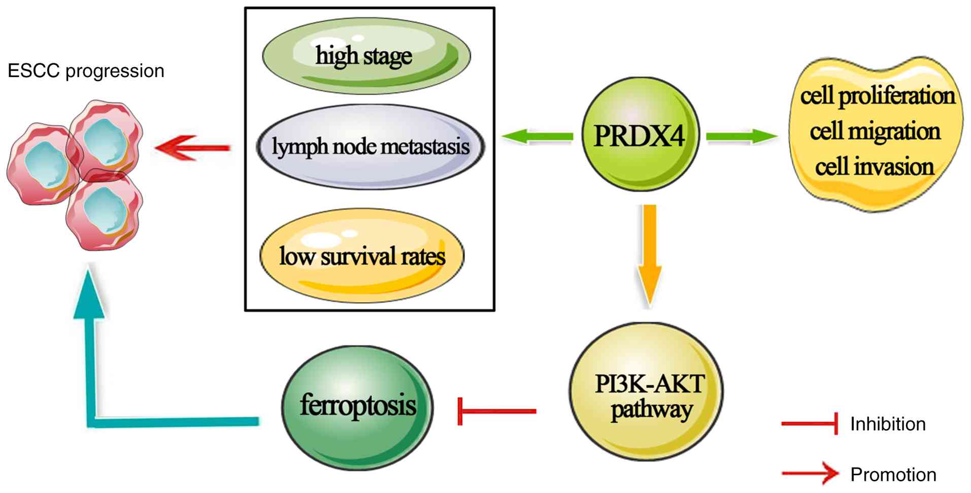 In conclusion, the present study revealed that PRDX4 is highly expressed in ESCC samples and cells. High PRDX4 expression was strongly linked to TNM stage and lymph node metastasis in patients with ESCC and may be a potential prognostic indicator in patients with ESCA. PRDX4 knockdown suppressed ESCC cell proliferation and invasion by inactivating the PI3K/AKT signaling pathway, which further triggered ferroptosis in these cells (Fig. 7). These findings suggest that targeting PRDX4 is a promising therapeutic strategy for ESCC, thereby providing valuable insights into treatment approaches for patients with ESCC.