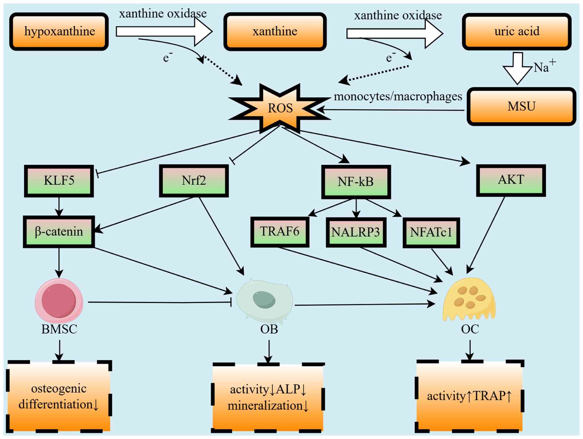 During purine metabolism, the formation of MSU is accompanied by redox reactions that lead to excessive production of reactive oxygen species (ROS). Concurrently, MSU activates immune cells to generate ROS, which interferes with bone remodeling by impairing osteogenesis and promoting bone resorption, ultimately resulting in joint destruction (21).