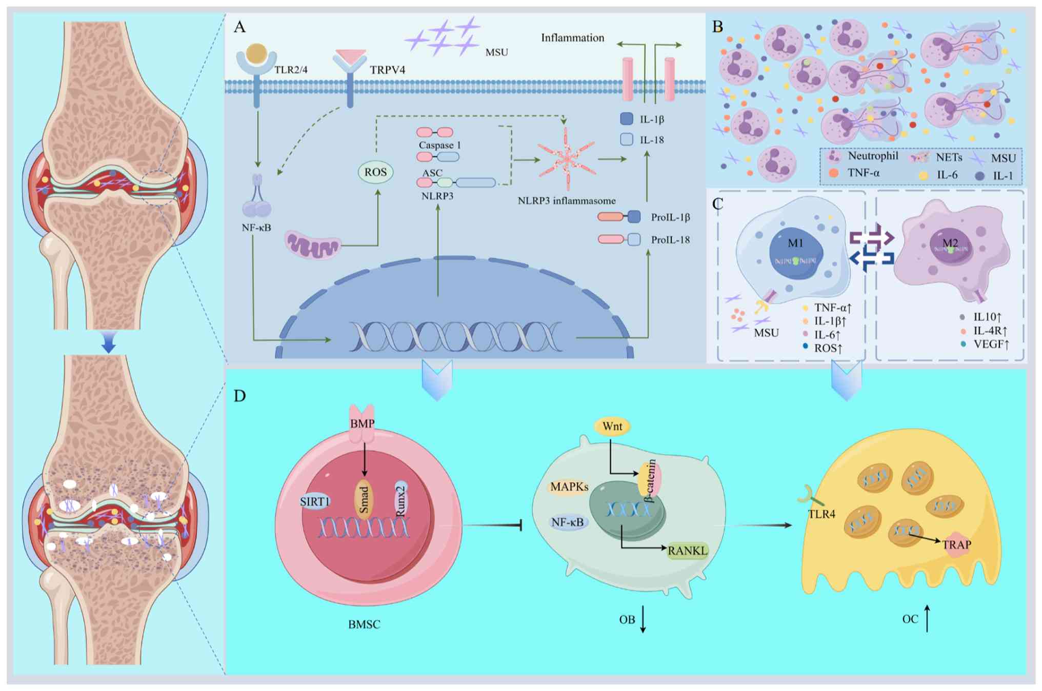 The central mechanism of gout-induced bone destruction involves the interplay between MSU crystals, which trigger inflammatory cascades and bone metabolism. MSU influences bone metabolism through dual-signal activation of the NLRP3 inflammasome, promotion of NET release, and regulation of macrophage polarization (38).