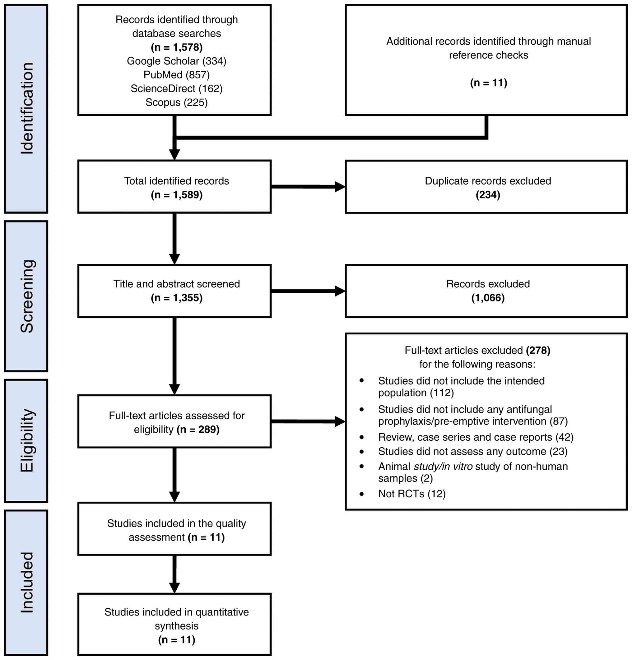 The literature search identified a total of 1,578 records through database searches, with an additional 11 records identified through manual reference checks. After removing duplicates, 1,355 records remained for title and abstract screening. Of these, 1,066 records were excluded due to not meeting the eligibility criteria, leaving 289 articles for full-text assessment. Following a detailed review, 278 articles were excluded for reasons including non-RCT design, inappropriate patient population, irrelevant intervention or absence of predefined outcomes. Ultimately, 11 RCTs met the inclusion criteria and were included in the meta-analysis (9,16-25). The study selection process is presented as a PRISMA flow diagram in Fig. 1.
