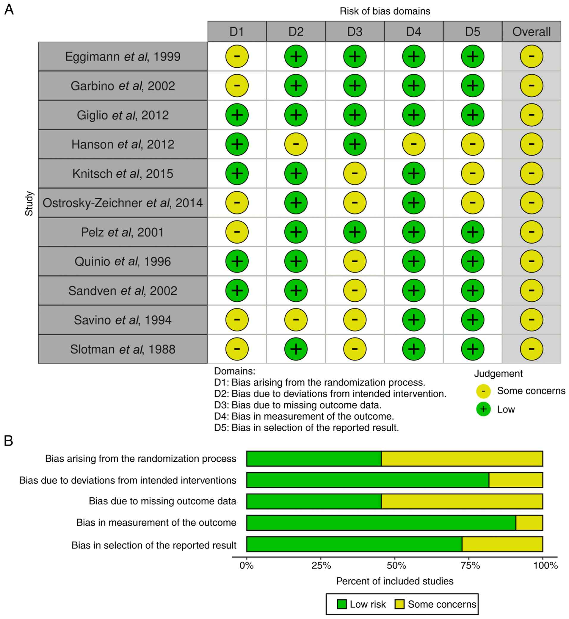 The risk of bias for the included RCTs was assessed using the Cochrane Risk of Bias 2.0 tool, which evaluates five domains: Bias arising from the randomization process, bias due to deviations from intended interventions, bias due to missing outcome data, bias in measurement of the outcome and bias in selection of the reported result (14). Each domain was rated as ‘low risk’, ‘some concerns’ or ‘high risk’ of bias. Visual summaries of the assessments were generated using the Risk-of-Bias VISualization tool (version 0.3.0.900) (15).
