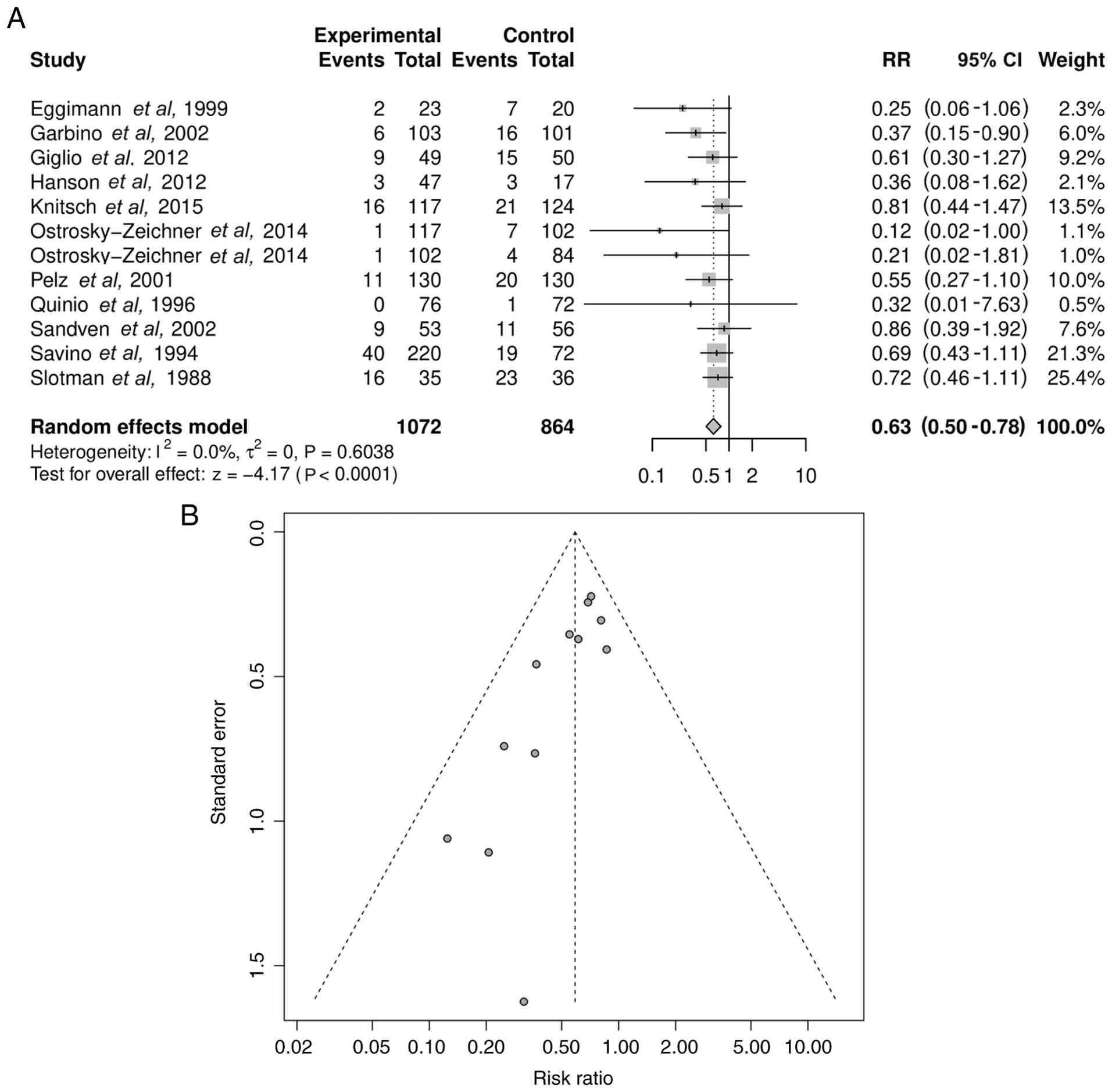 Meta-analysis of all 11 trials demonstrated a statistically significant reduction in the incidence of IFIs in patients receiving antifungal prophylaxis or pre-emptive therapy compared with the controls (RR=0.63; 95% CI, 0.50-0.78; P<0.0001; Fig. 3A). Heterogeneity was low (I2=0.0%; τ2=0; P=0.6038), supporting the robustness of the pooled estimate. The forest plot (Fig. 3A) illustrates the consistent direction of the effect across studies. The funnel plot for this analysis (Fig. 3B) appeared symmetrical, but Egger's test showed statistical evidence of publication bias (P=0.0009).