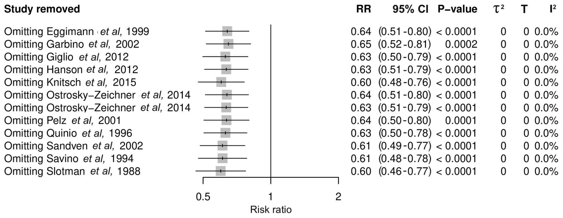 A leave-one-out sensitivity analysis was conducted to assess the robustness of the primary pooled effect (Fig. 4). In this analysis, the study of Ostrosky-Zeichner et al (20) was included twice since it presented two analyses of different interventions, prophylaxis and pre-emptive strategies. The omission of each individual study sequentially did not change the effect estimate. The recalculated RRs ranged from 0.60 to 0.65 and all 95% CIs remained below 1.0 (95% CI range, 0.48-0.81), with statistically significant results, indicating a consistent protective effect. No single trial exerted a disproportionate influence on the direction or magnitude of the overall outcome. Heterogeneity remained negligible across all iterations (I2=0%). These findings demonstrated that the pooled effect was stable and not driven by any single study.