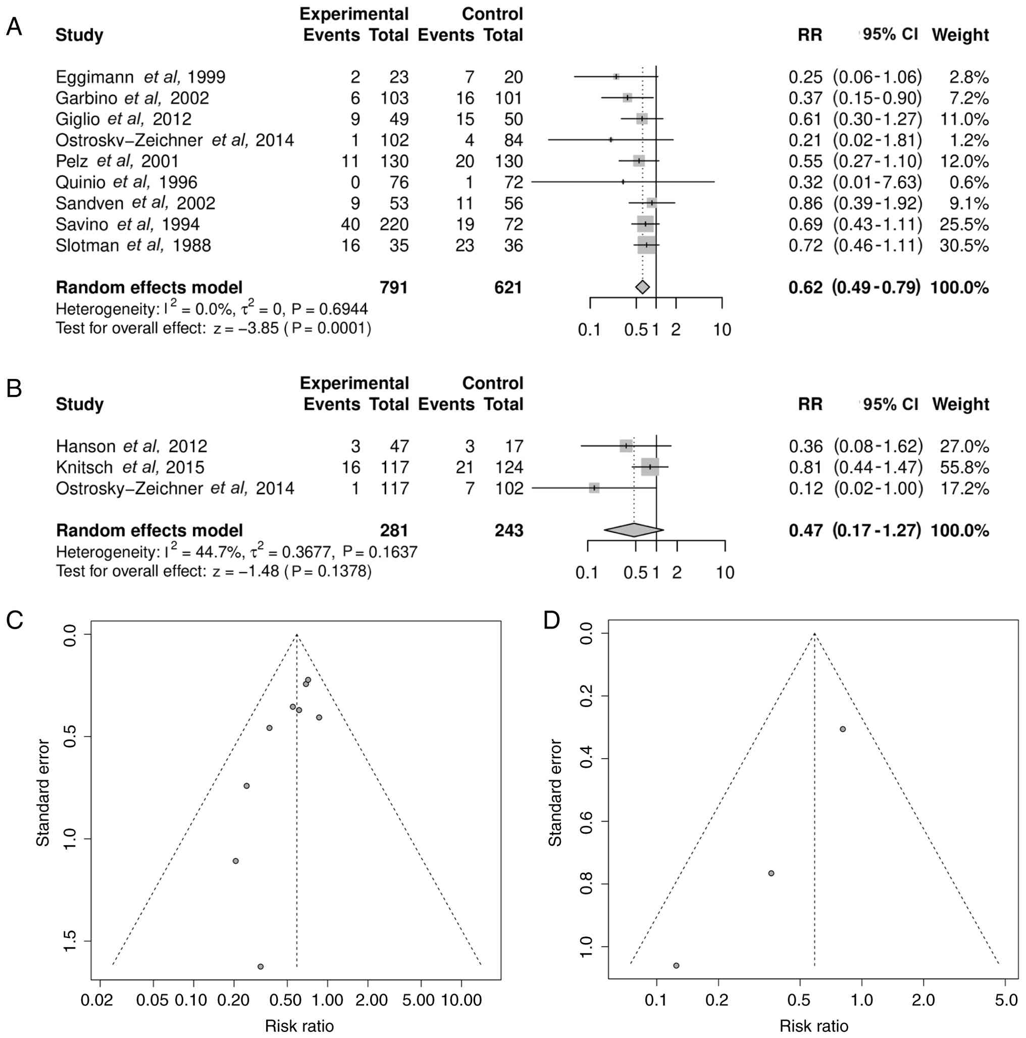 When stratified by strategy, prophylaxis significantly reduced IFI risk but pre-emptive therapy did not. Prophylaxis yielded a pooled RR of 0.62 (95% CI, 0.49-0.79; P=0.0001) with non-significant heterogeneity (I2=0.0%; τ²=0; P=0.6944), while pre-emptive therapy showed a pooled RR of 0.47 (95% CI, 0.17-1.27; P=0.1378) with moderate but non-significant heterogeneity (I2=44.7%; τ2=0.3677; P=0.1637) (Fig. 5A and B). The funnel plots for each subgroup (Fig. 5C and D) generally demonstrated symmetrical distribution, but there was a significant publication bias among publications analyzed in Fig. 5D as assessed by Egger's test (Fig. 5C, P=0.1138; Fig. 5D, P=0.0236).