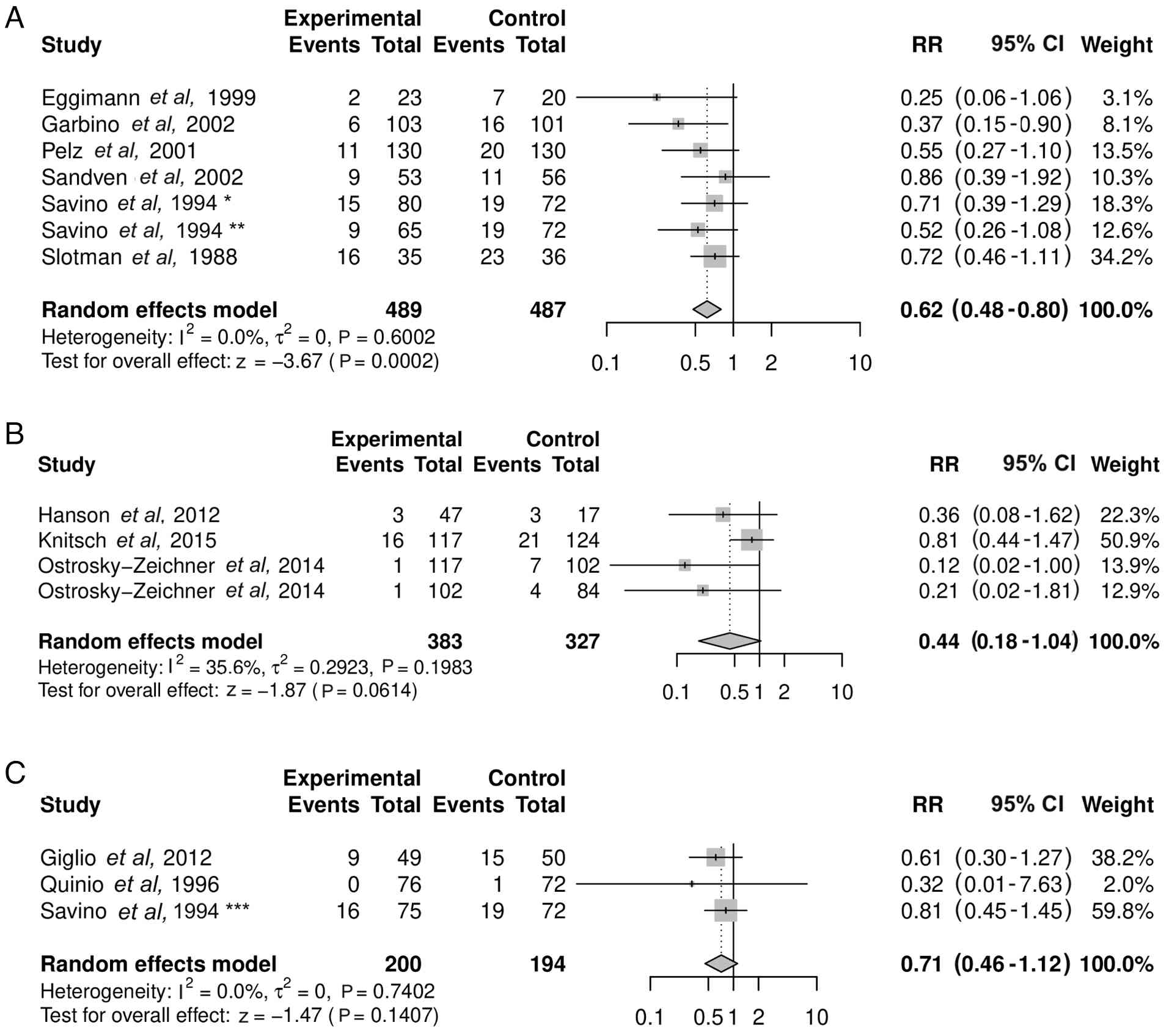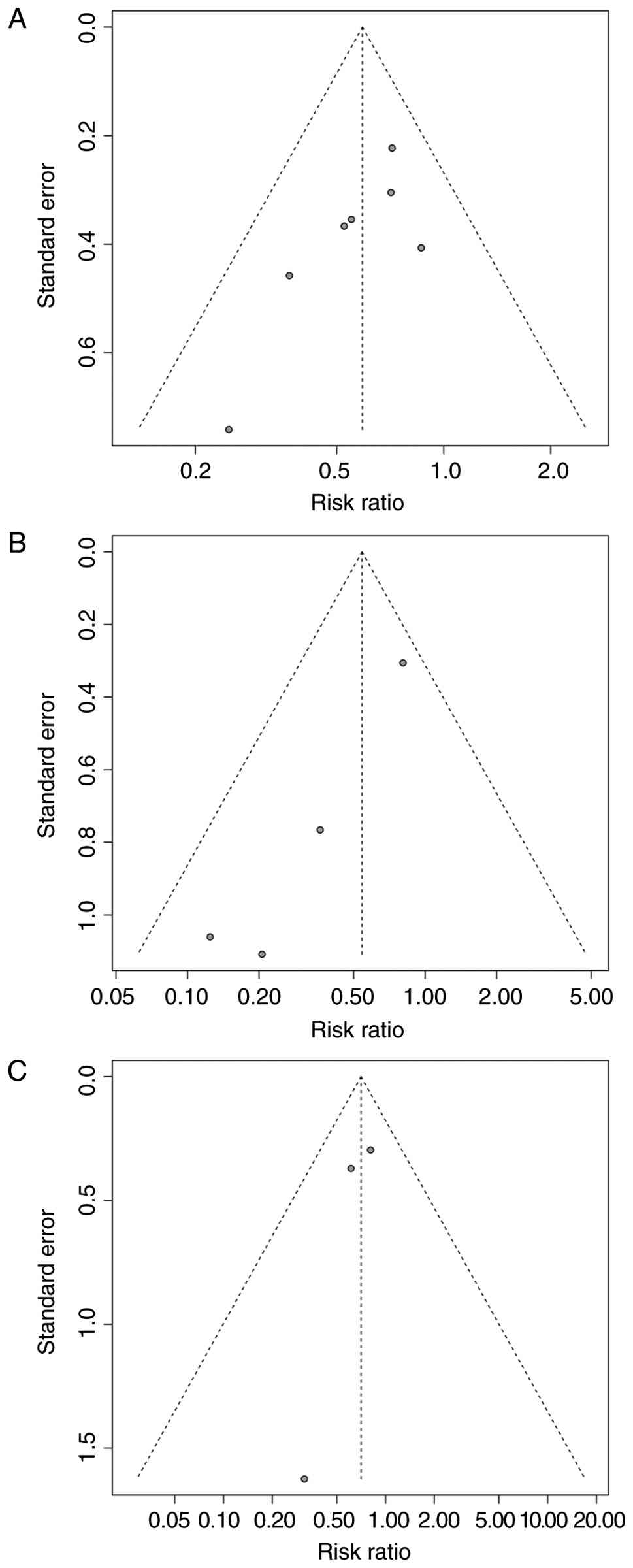 Azole prophylaxis was associated with a significant reduction in IFI risk (RR=0.62; 95% CI, 0.48-0.80; P=0.0002) and low heterogeneity (I2=0.0%; τ2=0; P=0.6002) (Fig. 6A). By contrast, echinocandin prophylaxis (RR=0.44; 95% CI, 0.18-1.04; P=0.0614) with heterogeneity of I2=35.6% (τ2=0.2923; P=0.1983) (Fig. 6B) and polyene prophylaxis (RR=0.71; 95% CI, 0.46-1.12; P=0.1407) with heterogeneity of I2=0.0% (τ2=0; P=0.7402) (Fig. 6C) were not significantly associated with protection from IFI risk. In this analysis, the study of Ostrosky-Zeichner et al (20) was included twice since it presented analyses of two different interventions, prophylaxis and pre-emptive strategies. This analysis also separated the study of Savino et al (24) since by three different types of intervention, clotrimazole, ketoconazole and nystatin. The funnel plots for azoles (Egger's test P=0.0615), echinocandins (Egger's test P=0.0207) and polyenes (Egger's test P=0.4220) (Fig. 7A-C) were symmetrical, indicating no strong evidence of publication bias except for the studies that investigated echinocandins.