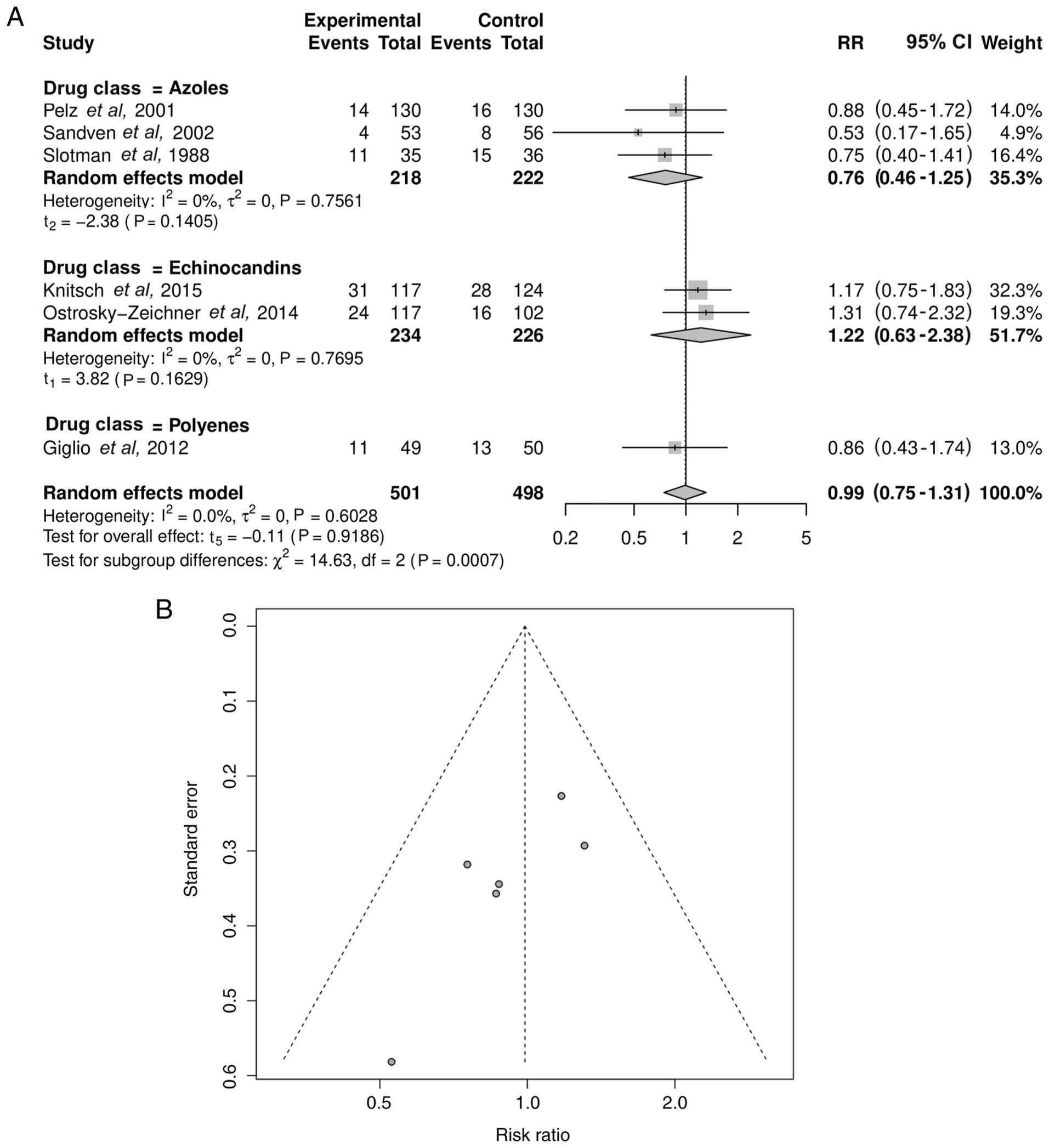 In total, 6 trials reported all-cause mortality. Pooled analysis revealed no significant difference in the mortality risk between the antifungal prophylaxis and control groups (RR=0.99; 95% CI, 0.75-1.31; P=0.9186) with low heterogeneity (I2=0.0%; τ2=0; P=0.6028) (Fig. 8A). The funnel plot for mortality (Fig. 8B) was symmetrical (Egger's test P=0.0563).