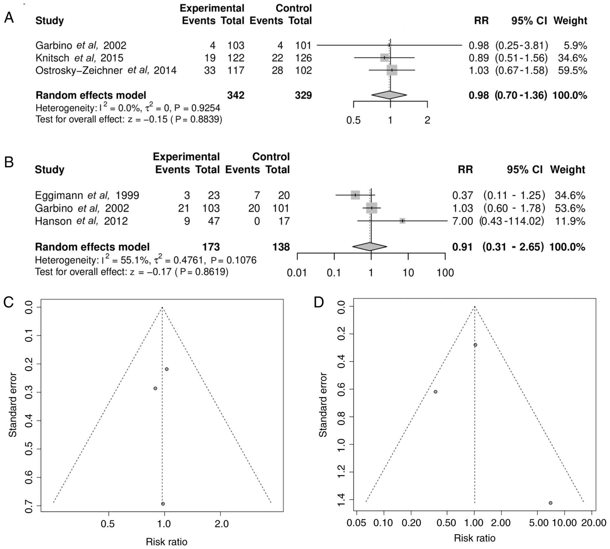 In total, 3 trials reported severe adverse events. Pooled analysis revealed no significant association between antifungal prophylaxis and the risk of severe adverse events (RR=0.98; 95% CI, 0.70-1.36; P=0.8839) with heterogeneity of I2=0.0% (τ2=0; P=0.9254) (Fig. 9A). In total, 3 trials reported liver function outcomes. The pooled RR for liver dysfunction was 0.91 (95% CI, 0.31-2.65; P=0.8619) with heterogeneity of I2=55.1% (τ2=0.4761; P=0.1076) (Fig. 9B). The corresponding funnel plots (Fig. 9C and D) showed a balanced distribution (Egger's test P=0.8266 and 0.8852, respectively), suggesting no major publication bias.