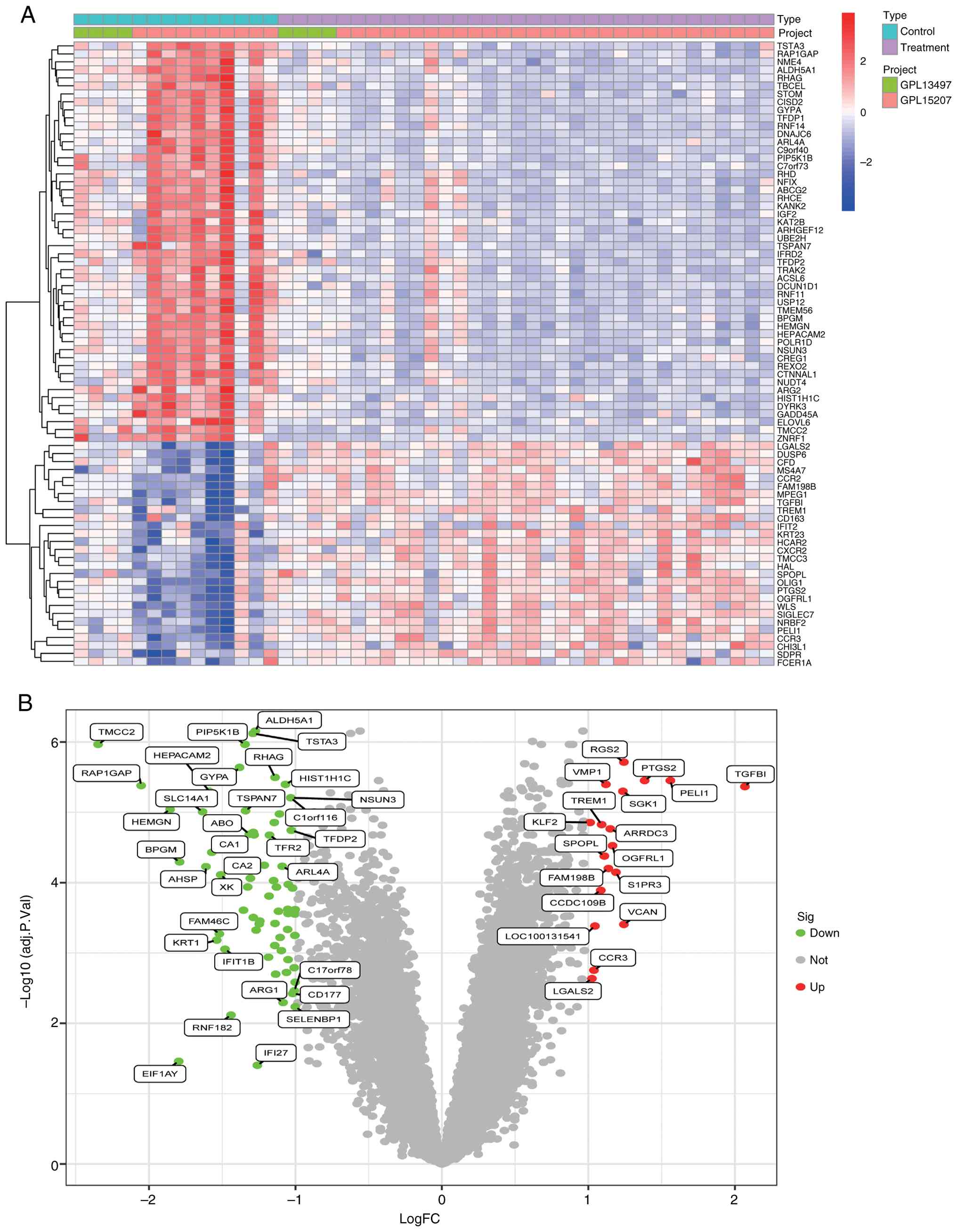 After identifying the disease-related signature gene through the established screening criteria, samples were classified into high and low expression groups based on the signature gene expression levels using the limma package (version: 3.58.1) in R. The filtering criteria were set as logFC >1 and adj.P.Val <0.05. DEGs associated with the signature gene were identified through correlation analysis, with genes exhibiting a strong correlation selected for further analysis. Data visualization was performed using heatmaps and volcano plots, while gene correlations were illustrated through correlation bubbles generated using the corrplot package.