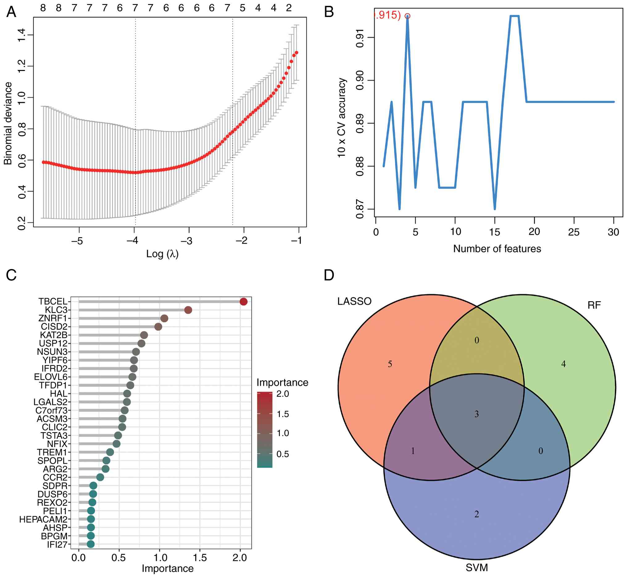 To identify differentially expressed genes (DEGs), a multi-step approach was employed. The limma package in R (version 3.58.1) was used to filter DEGs from all datasets, applying the criteria of logFC >1 and an adjusted P-value <0.05. Following DEG screening, feature genes were selected using Lasso regression, with the glmnet (version 4.1-7) and e1071 (version 1.7-14) packages. Additionally, the Support Vector Machine (SVM) algorithm, implemented via the e1071 package (version 1.7-14), was applied to DEGs to identify another set of feature genes. Finally, Random Forest (RF) analysis was conducted on the DEGs using ggplot2 software, and genes with a gene importance score greater than 2 (rfGenes >2) were selected. By intersecting the characteristic genes identified by these three methods, a final subset of significant genes was obtained. One of these genes was chosen for further investigation as a potential marker gene.