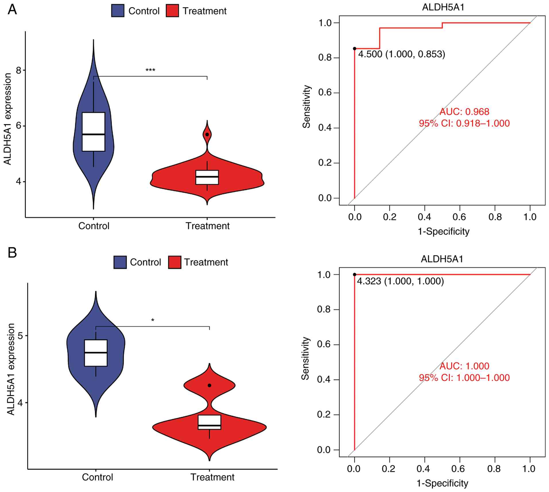 To evaluate the discriminative ability of the three identified feature genes, ROC analysis was performed for ALDH5A1, TBCEL, and KAT2B (Fig. S1). The results indicated that all three genes possessed robust diagnostic potential; however, ALDH5A1 exhibited the superior diagnostic accuracy with an AUC of 0.968, compared to 0.931 for TBCEL and 0.899 for KAT2B. Consequently, ALDH5A1 was selected as the optimal biomarker for further analysis. The violin plot generated using the ggpubr software (Fig. 3A) indicated that the expression level of ALDH5A1 in the ONFH group was significantly lower than in the normal group (P<0.05). Validation of these findings in the validation group was confirmed through the violin plot (Fig. 3B) and corresponding ROC curve, further supporting the reliability and accuracy of the ALDH5A1 marker identified in the experimental group samples.
