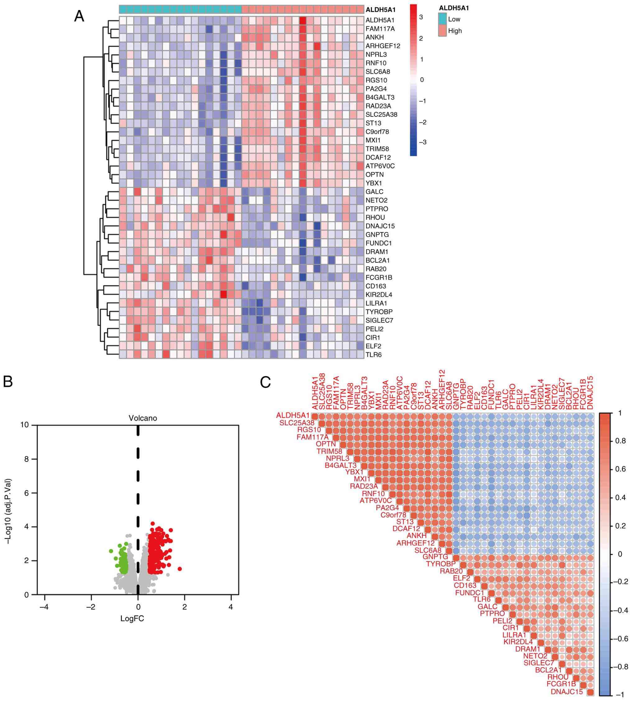 In the correlation study of ALDH5A1, as shown in the volcano map and differential heatmap (Fig. 4A and B), a correlation analysis filter identified 39 DEGs associated with ALDH5A1. Among them, 20 were upregulated and 19 were downregulated. The correlation and expression pattern of these ALDH5A1-related DEGs are depicted in the bubble plot (Fig. 4C).
