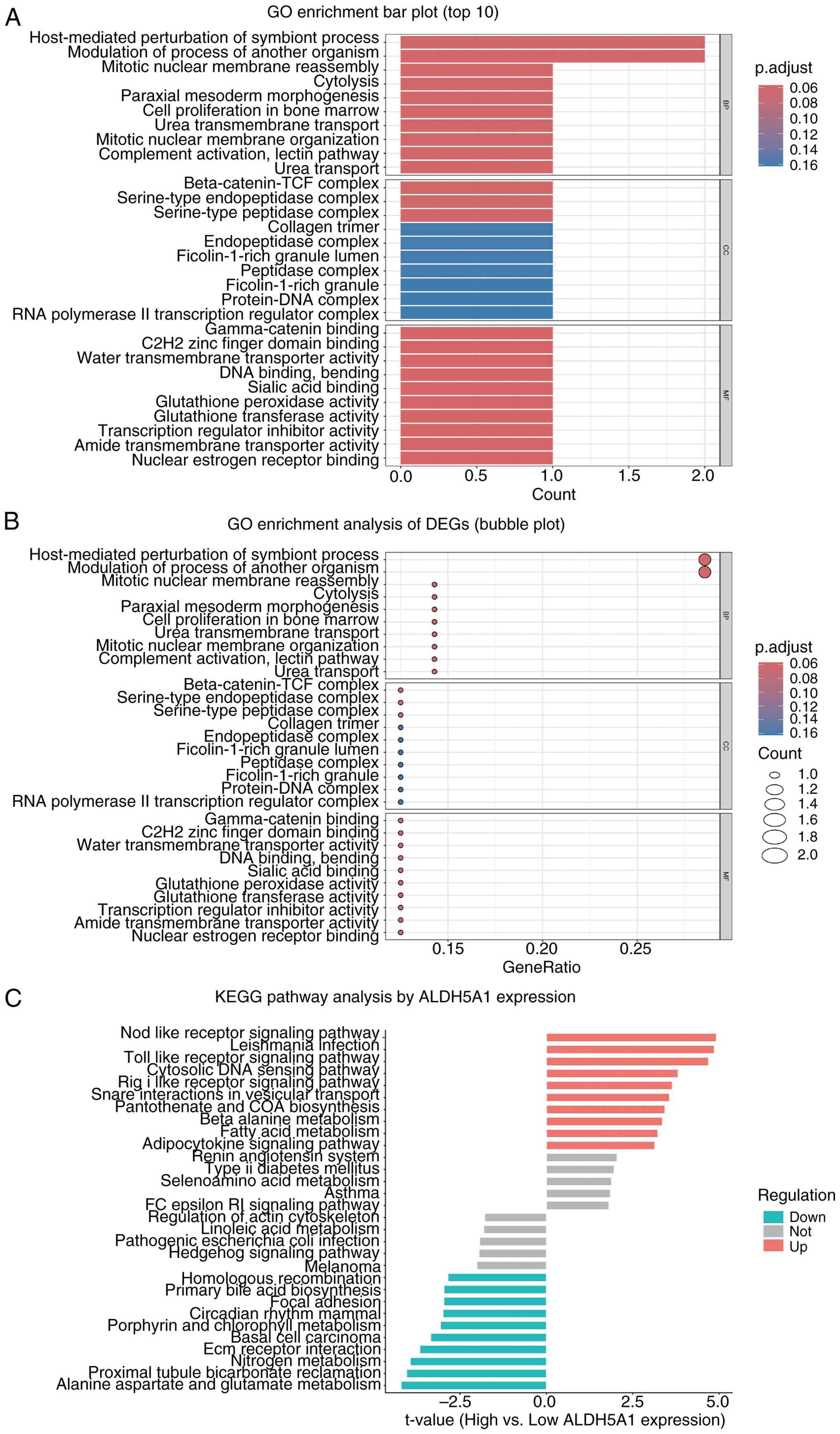 The results of the GO enrichment analysis are detailed in Fig. 5. The bar plot (Fig. 5A) highlights the top significant terms, showing that ALDH5A1-related DEGs are primarily enriched in biological processes such as anion transmembrane transport and regulation of autophagy. The bubble plot (Fig. 5B) complements this, displaying GeneRatio, adjusted P-values, and gene counts for these significant terms. In terms of CC, DEGs are predominantly localized in lysosomes and azurophilic granules. Regarding MF, DEGs are strongly associated with transmembrane transporter activity. These results suggest that ALDH5A1 may influence ONFH pathophysiology by participating in signal transduction pathways that regulate autophagy. According to Gene Set Variation Analysis (GSVA), upregulated genes among the DEGs related to ALDH5A1 are primarily enriched in pathways such as nitric oxide receptor signaling, Leishmania infection, TOLL-like receptor signaling, cytosolic DNA sensing, RIG-like receptor signaling, and vesicle transport. Conversely, downregulated genes are enriched in pathways associated with proximal tubular bicarbonate reclamation, nitrogen metabolism, ECM-receptor interactions, basal cell carcinoma, porphyrin and chlorophyll metabolism, and the mammalian circadian rhythm (Fig. 5C).