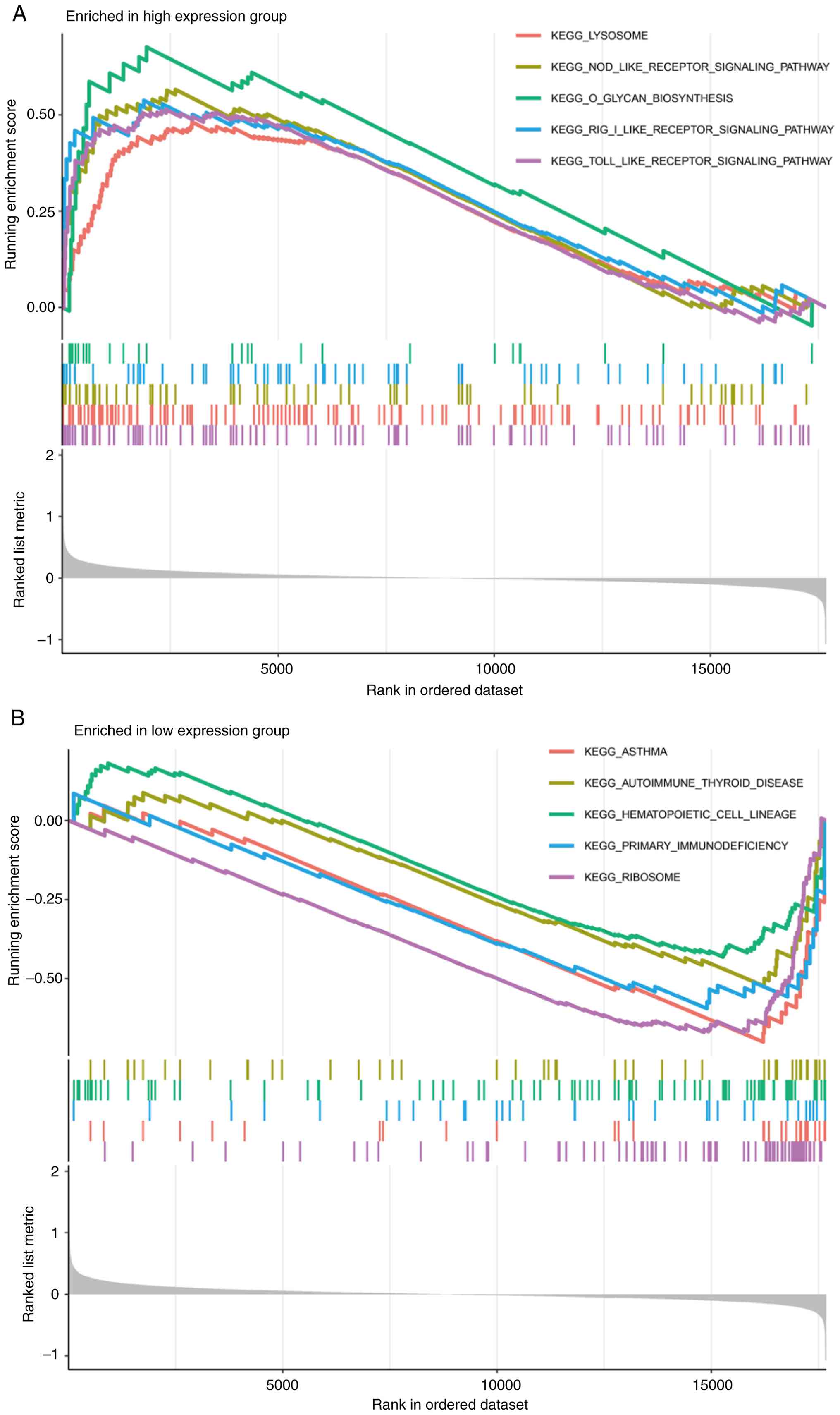 Kyoto Encyclopedia of Genes and Genomes (KEGG) pathway enrichment analysis was performed to identify significantly enriched pathways (https://www.kegg.jp/). To explore the functional enrichment of DEGs linked to the signature gene, Gene Ontology (GO) enrichment analyses were performed, focusing on biological processes (BPs), cellular components (CCs), and molecular functions (MFs). Gene Set Enrichment Analysis (GSEA) was performed to assess the enrichment and scoring values for the high and low expression groups of the signature gene, providing insights into their significance in relevant biological processes and functions.
