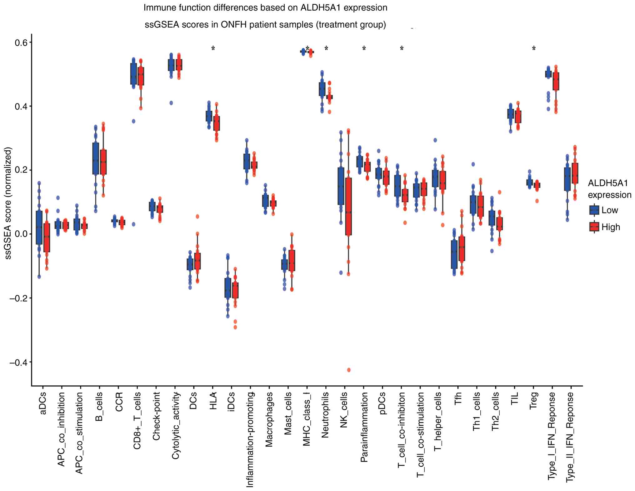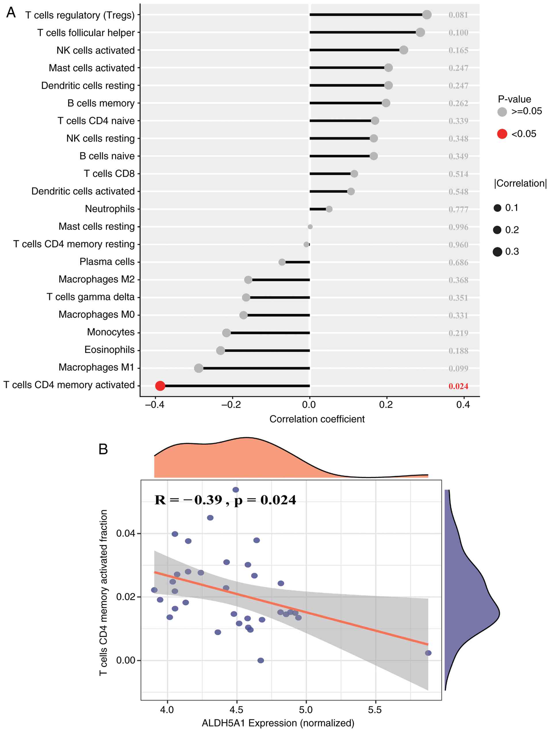 Immune-related functional analysis revealed significant differences between the two ALDH5A1 expression groups in terms of HLA and MHC class I molecular functions, neutrophil and T cell co-inhibition, and regulatory T cell functions (Fig. 7). These functions were particularly active in the low ALDH5A1 expression group. Immune cell infiltration analysis, depicted in the bubble plot (Fig. 8A), shows the distribution of 22 immune cell types across the normal and ONFH groups. The volcano plot (Fig. 8B) illustrates a strong negative correlation between activated CD4+ memory T cells and memory B cells, T cells, follicular helper cells, dendritic cells, and activated NK cells. Additionally, the lollipop plot (Fig. 9A) demonstrates a significant association (P<0.05) between immune cells and ALDH5A1, with the most notable finding being a negative correlation between ALDH5A1 and activated CD4+ memory T cells (Fig. 9B). These results highlight the complex interactions between immune cells that contribute to ONFH progression and suggest that ALDH5A1 plays a key regulatory role in this immune network.