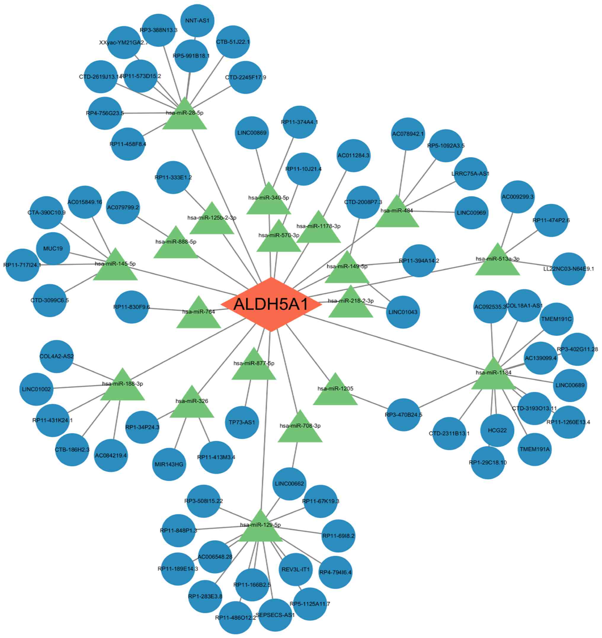 Our analysis also highlighted significant differences in immune cell functions, including HLA and T cell co-inhibition, between the high and low ALDH5A1 expression groups (9). Notably, ALDH5A1 expression was significantly negatively correlated with activated CD4+ memory T cells (33), suggesting a potential link between ALDH5A1's metabolic role and the immune microenvironment in ONFH, which warrants further investigation (34). Finally, a predictive mRNA-miRNA-lncRNA ceRNA network was constructed, revealing complex upstream regulatory mechanisms for ALDH5A1 (Fig. 10). While this network is purely predictive, it provides a foundation for future studies on the regulation of ALDH5A1 in ONFH.