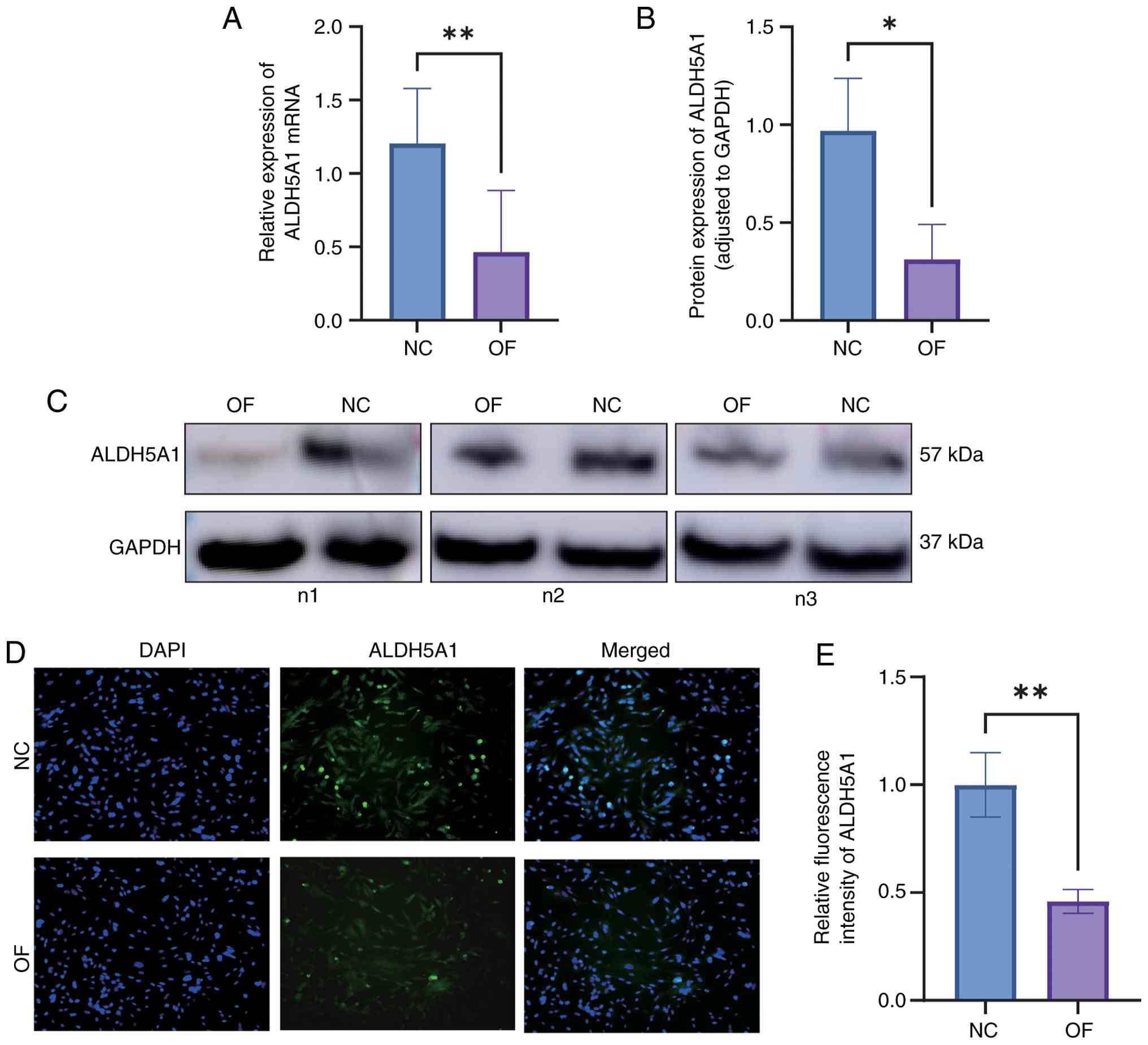 Bioinformatics analysis revealed a significant decrease in ALDH5A1 expression in chondrocytes from the ONFH group compared to the normal group (P<0.05). This was corroborated by qRT-PCR, which showed a marked reduction in ALDH5A1 mRNA levels in the ONFH group (Fig. 11A). Western blot analysis further confirmed that ALDH5A1 protein expression was significantly lower in the ONFH group than in the normal group (P<0.05) (Fig. 11B and C). Immunofluorescence staining also demonstrated reduced ALDH5A1 fluorescence intensity in the ONFH group relative to the normal group (Fig. 11D and E). The relative fluorescence intensity of ALDH5A1 in the ONFH group was significantly lower (P<0.01), providing additional support for the decreased ALDH5A1 expression in ONFH chondrocytes. These findings from bioinformatics, qRT-PCR, Western blot, and immunofluorescence analyses collectively confirm that ALDH5A1 expression is significantly reduced in ONFH samples compared to normal controls.