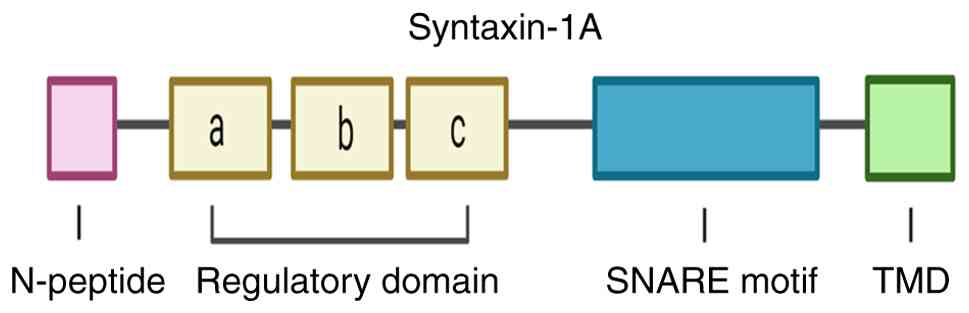 STX1A is a member of the syntaxin family and is encoded on human chromosome 7q11.23. It comprises 288 amino acids and is one of two isoforms of Syntaxin1, the other being Syntaxin1B (STX1B) (16). STX1A is primarily localized on the plasma membrane. It has four major structural components: An N-terminal peptide (N-peptide), an N-terminal regulatory domain (Habc), a SNARE domain (also known as the H3 domain), and a C-terminal transmembrane domain (TMD) (17) (Fig. 1). The N-peptide is connected to the Habc domain by a flexible region, and the Habc domain is linked to the H3 domain through a linker region. Additionally, the H3 domain is connected to the TMD by a short polybasic juxtamembrane domain. The Habc domain (18) is a highly conserved domain composed of three antiparallel α-helices and plays a crucial role in synaptic transmission in mammals (18). Moreover, the Habc domain interacts with key proteins, including synaptotagmin-1 (Syt1) (19), voltage-gated calcium channels (VGCCs), and Munc18-1, thereby facilitating the precise recruitment of the STX1A-Munc18-1 complex to the active zone (AZ) (20). The SNARE domain of STX1A contains a highly conserved sequence of 60-70 residues with heptanucleotide repeats (21). Significantly, STX1A contributes a Qa-SNARE motif to the SNARE complex, assembling with synaptosomal-associated protein of 25 kDa (SNAP-25; Qbc-SNARE motifs) and synaptobrevin (VAMP; R-SNARE motif) in a 1:1:1 ratio to form a stable four-helix bundle, a structural prerequisite for vesicle fusion and neurotransmitter exocytosis (22). The Habc domain can also interact with its own SNARE motif, forming a ‘closed’ conformation that regulates STX1A activity, a process modulated by its interaction with neuronal Sec1 (nSec1; also known as rbSec1 or Munc18-1) (23). Furthermore, the C-terminal TMD of STX1A primarily anchors the membrane through its hydrophobic region.