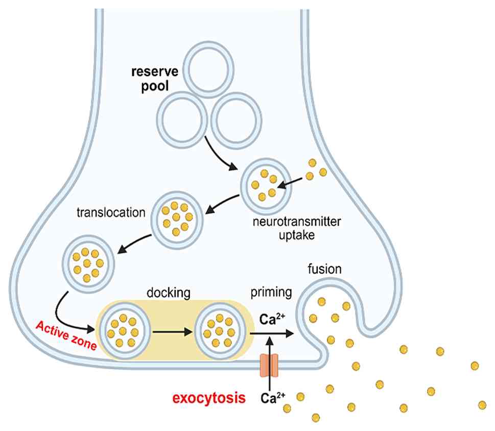 Synaptotagmin is a synaptic vesicle protein evolutionarily conserved across species. It comprises an N-terminal single TMD, an unstructured linker region, and two cytoplasmic protein kinase C-like C2 domains (C2A and C2B) (53). The C2B domain has a high affinity for Ca²+ and is primarily responsible for triggering vesicle-plasma membrane fusion. By contrast, the C2A domain contributes to vesicle docking and mobility. Syt1, the principal isoform in synapses, serves as a Ca²+ sensor during neurotransmission. Upon Ca²+ influx, Syt1 binds phospholipids through its C2 domains, promoting membrane fusion. In vitro experiments have shown that Syt1 can dock vesicles by binding to STX1A/SNAP-25 receptor complexes, further emphasizing its central role in Ca²+-dependent neurotransmitter release (55).