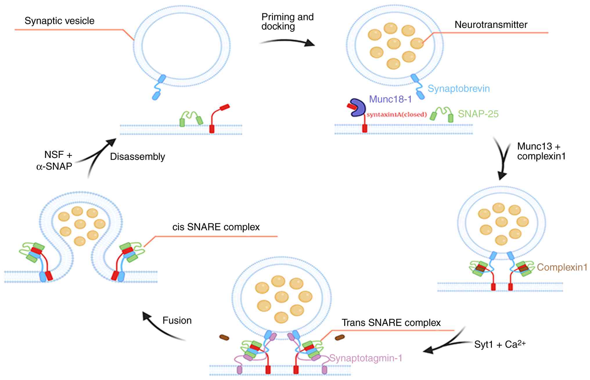 In the synapse, a small number of vesicles reside at specific sites in the presynaptic membrane AZ. By contrast, most vesicles are transported to areas near the cell membrane after synthesis, forming a reserve pool. Neurotransmitter release by neuronal exocytosis (Fig. 2) can be divided into several steps, including vesicle mobilization, docking, priming, fusion, and recycling (28). During rest, synaptic vesicles in the readily releasable pool within the AZ participate in neurotransmitter release. In addition, the AZ is enriched in cytoskeletal and scaffold proteins, forming a dense matrix that facilitates the anchoring, preparation, and rapid release of synaptic vesicles. In neuronal and endocrine cells, priming is a necessary rate-limiting step in secretion, in which vesicles are released only after priming. Moreover, SNARE proteins mediate vesicle priming and membrane fusion (29). In the resting state, STX1A is in a ‘closed’ conformation and cannot participate in the assembly of the SNARE complex. Following an action potential burst, a signal spreads along the axon to the presynaptic membrane, depolarizing the axon. Subsequently, this opens VGCCs, triggering Ca²+ influx. Elevated intracellular Ca²+ facilitates the recruitment of primed vesicles from the reserve pool to AZ through interactions with Rab proteins (30), RIM, and Munc13. These vesicles are tethered to the plasma membrane, forming trans-SNARE complexes, a process known as vesicle priming (31). The influx of Ca²+ binds to synaptotagmin (a Ca²+ sensor), with the assistance of the complexin protein, thereby interacting with STX1A to induce an open conformation. Consequently, this promotes SNARE complex assembly through a series of ordered and continuous reactions. In the priming phase, STX1A and SNAP-25 form a t-SNARE complex on the target membrane, which then assembles with VAMP2 (32,33) (on the vesicle membrane), forming a trans-SNARE complex or SNAREpin. This complex forms through a zipper-like mechanism from the N-terminal to the C-terminal regions, pulling the vesicle and plasma membranes into close apposition and providing energy for lipid bilayer fusion (34). Subsequently, primed vesicles are drawn toward the plasma membrane and fuse with it. During this process, the trans-SNARE complex is converted into cis-SNARE complexes, which form a fusion pore and release neurotransmitters from synaptic vesicles into the synaptic cleft (35). In addition, changes in calcium ion concentration directly affect the amount of neurotransmitter released and are necessary for vesicle fusion with the presynaptic membrane (36). Following membrane fusion, the resulting cis-SNARE complexes are disassembled by the AAA+ ATPase NSF (37) and its cofactor α-soluble NSF attachment protein (α-SNAP). This ensures that SNARE can be recycled for the next round of fusion, thereby maintaining the efficiency of synaptic transmission (Fig. 3).