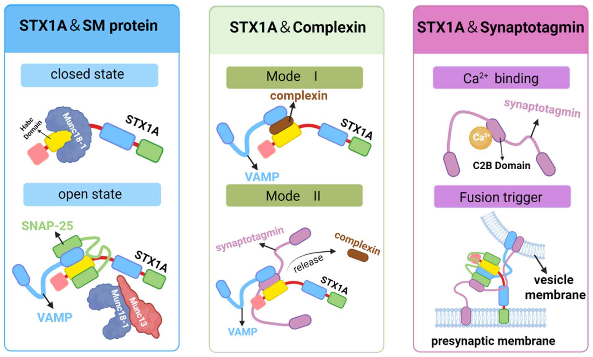 STX1A functions within a precisely coordinated presynaptic protein network. As such, it engages in dynamic interactions with essential accessory proteins, including Sec1/Munc18 (SM) proteins, complexin, and synaptotagmin. Notably, these interactions finely regulate synaptic vesicle fusion and sustain neurotransmitter homeostasis (Fig. 4).