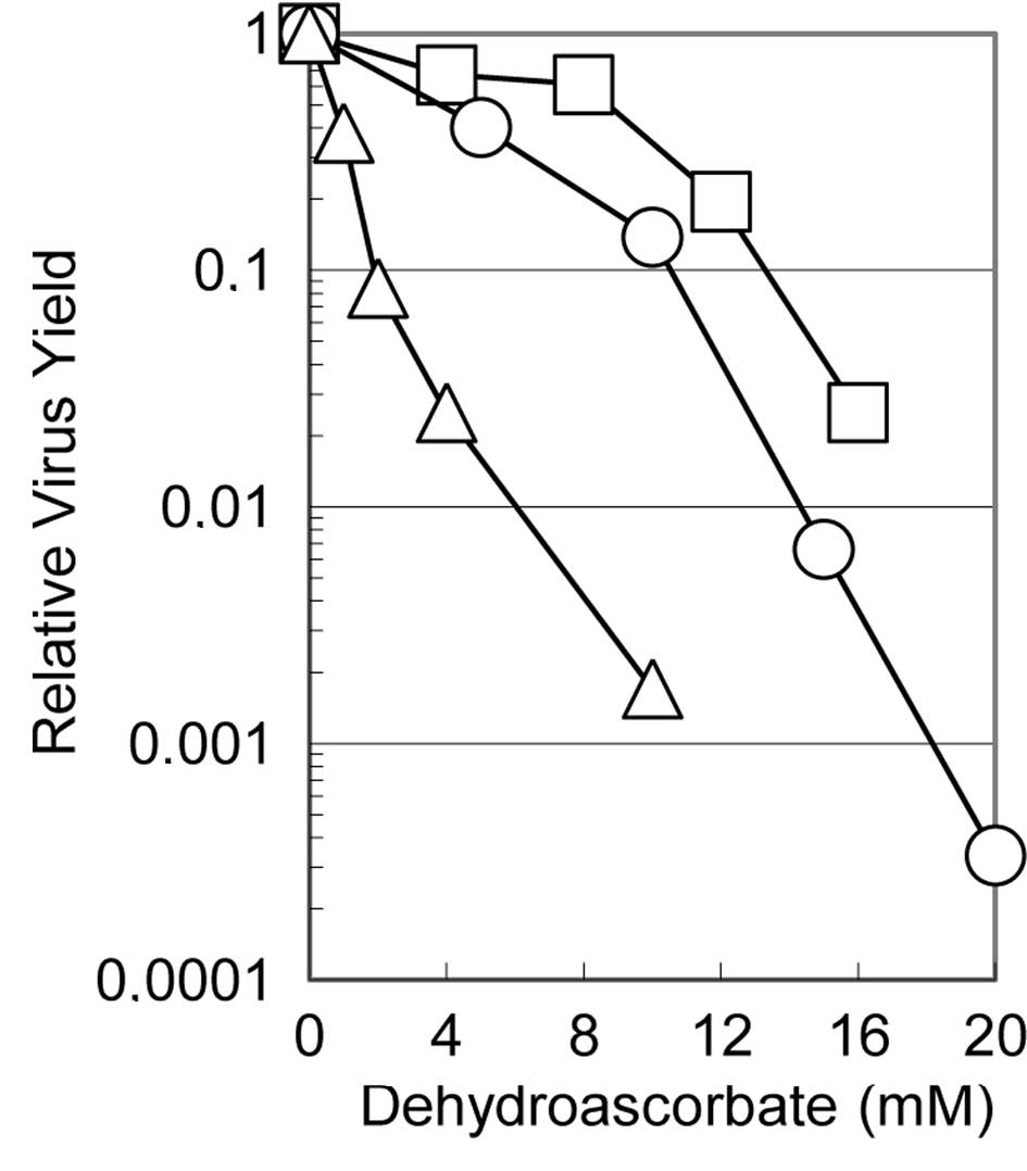 Fig. 1 shows the effects of dehydroascorbic acid on the relative virus yields of these three viruses when the cells infected with each of the viruses were incubated in the medium containing the indicated concentrations of the reagent. The multiplication of all three viruses was suppressed to various degrees depending on the virus, although these viruses showed a similar degree of sensitivity to ascorbic acid as in the previous study (5). The virus yield decreased with increasing concentrations of dehydroascorbic acid: with 10 mM of the reagent, the yield of influenza virus, HSV-1 and poliovirus was approximately one thousandth, one tenth and half that in the absence of the reagent, respectively, indicating that influenza virus is the most sensitive and poliovirus is the least sensitive of these viruses. These results clearly show that dehydroascorbic acid inhibits the multiplication of viruses of widely different structures (regardless of whether they are enveloped or non-enveloped, double-stranded DNA- or single-stranded RNA-genome) and also that it inhibits virus multiplication whether the replication and transcription of the viral genome occur in the nucleus or in the cytoplasm of the infected cells. It is also worth noting that the antiviral activity of the reagent was apparently independent of the cell type, as the multiplication of the influenza virus was examined in MDCK cells (derived from canine kidney cells), while that of HSV-1 and poliovirus was examined in HEp-2 cells (derived from human cervical carcinoma).