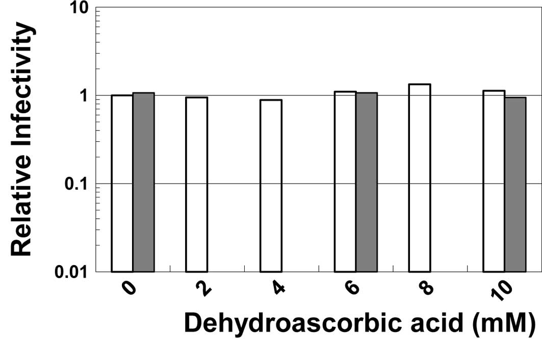 To examine the direct effect of dehydroascorbic acid on the infectivity of viruses, HSV-1 or poliovirus was incubated in the buffered solutions containing the reagent at various concentrations. As shown in Fig. 2, neither the infectivity of HSV-1 nor of poliovirus was inactivated by incubation with the reagent even at 10 mM, indicating that dehydroascorbic acid does not directly inactivate these viruses. Similar results were observed when the viruses were incubated in buffer at a neutral pH (data not shown).