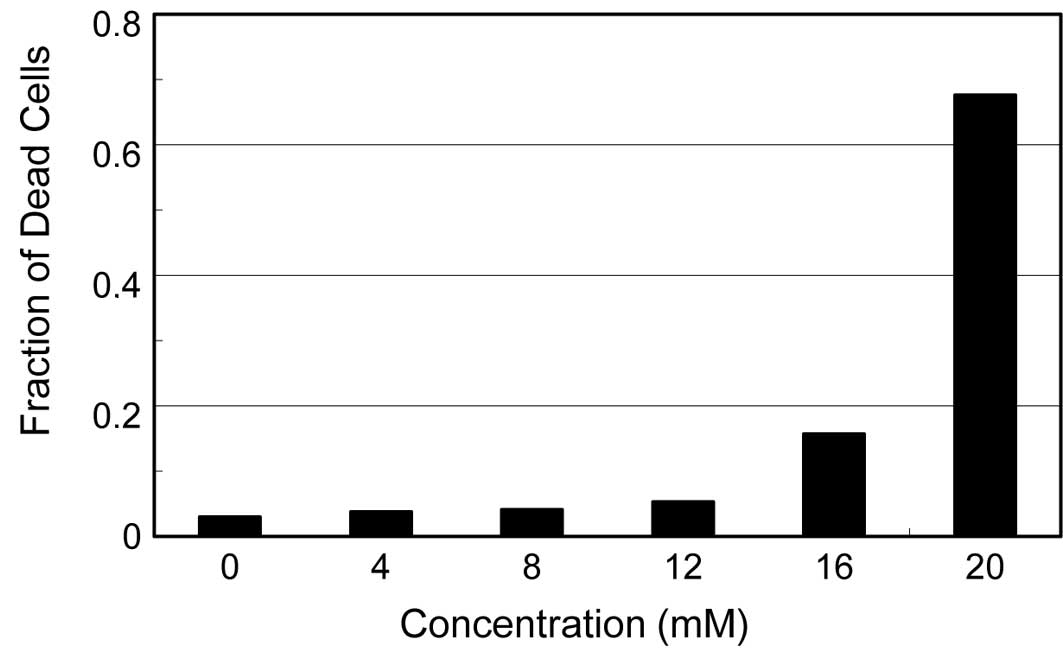 Ascorbic acid is known to generate hydroxyl radicals, even in the presence of a trace amount of ferric ion in medium. We previously reported that ascorbic acid causes a severe cytotoxic effect in cells, probably due to these hydroxyl radicals (5). Since dehydroascorbic acid also induced a significant degree of cytopathic effects (cell rounding and detachment from the dish surface) on the virus-infected cells, we examined the effects of the reagent on the viability of the uninfected cells. As shown in Fig. 3, HEp-2 cells incubated in medium containing various concentrations of dehydroascorbic acid for 24 h showed no increase in the fraction of dead cells even at 12 mM of reagent, although a significant amount of dead cells appeared at 16 mM and increased drastically to approximately 70% at 20 mM. These results indicate that, although the reagent induces significant cytopathic effects on the virus-infected HEp-2 and MDCK cells, the cytotoxic effect of this reagent is likely insufficient to directly affect the multiplication of the viruses in the infected cells, considering the concentration of dehydroascorbic acid required for the significant antiviral activities, i.e., approximately 10 mM.