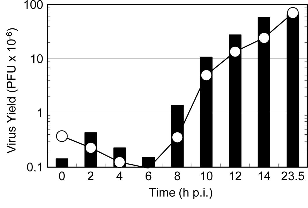 Previously, we quantitatively characterized the kinetics of viral DNA replication, the encapsidation of viral DNA, the envelopment of nucleocapsids and the formation of infectious progeny virus in HSV-1-infected cells (13), and revealed that viral DNA replication occurs exclusively between 3 and 6 h post infection (p.i.) and that a large amount of DNA accumulates in the infected cells when the replication of the virus DNA is completed. The formation of nucleocapsids as well as the envelopment of these nucleocapsids begins at 5 h p.i., simultaneously with the formation of infectious progeny virus, and the amount of the progeny virus increases with time until approximately 14 h p.i.