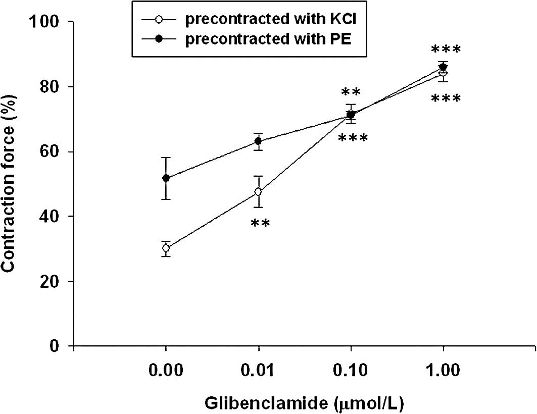 Glibenclamide produced a concentration-dependent (0.01–1 μmol/l) attenuation of the relaxant effect of loperamide on tonic contraction of phenylephrine (1 μmol/l)-precontracted prostate strips. The prostatic relaxation by loperamide in KCl (50 mmol/l)-pre-treated prostate strips was also abolished in a similar manner by the treatment of glibenclamide (Fig. 3).