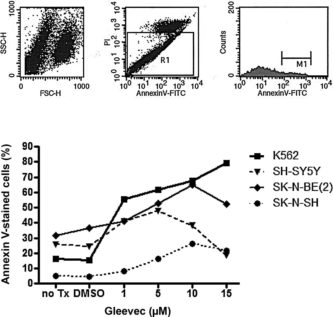 Initially, we assessed the effects of STI-571 on three neuroblastoma cell lines: SK-N-BE(2), which has an MYCN amplication and expresses the N-Myc protein; SH-SY5Y, which expresses the N-Myc protein, but does not have an MYCN amplification; and SK-N-SH, which does not express N-Myc protein or have an MYCN amplification (6,7). K562 cells, which have a bcr-abl translocation, were used as a positive control. The percentage of Annexin V-positive neuroblastoma cells was increased in the cell lines treated with concentrations >1 μM STI-571 (Fig. 1). Notably, the percentage of Annexin V-positive cells was increased to a greater extent in the SK-N-SH cells than in the SH-SY5Y or SK-N-BE(2) cells. Additionally, the percentage of Annexin V-positive cells decreased at STI-571 concentrations of 10 and 15 μM in the neuroblastoma cell lines. This was attributed to the removal of the dead cell fraction occurring during the washing procedure.