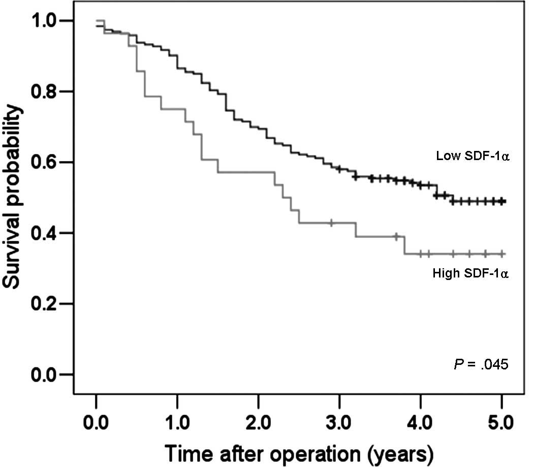 The present study has some limitations. As the determination of CXCR4 and SDF-1α expression was dependent solely on immunohistochemistry, the possibility exists of errors due to diagnostic inaccuracy. To obtain more accurate results, several other methods such as Western blotting, quantitative mRNA expression, or gene expression profiling should be considered simultaneously. Also, all clinicopathological data were collected retrospectively. Accordingly, a well-planned prospective study incorporating multiple validating techniques such as Western blotting is warranted in the future. In conclusion, CXCR4 and SDF-1α expression may reflect the prognosis of patients with gastric cancer, such that a combination of high CXCR4 and high SDF-1α expression suggests a dismal prognosis.