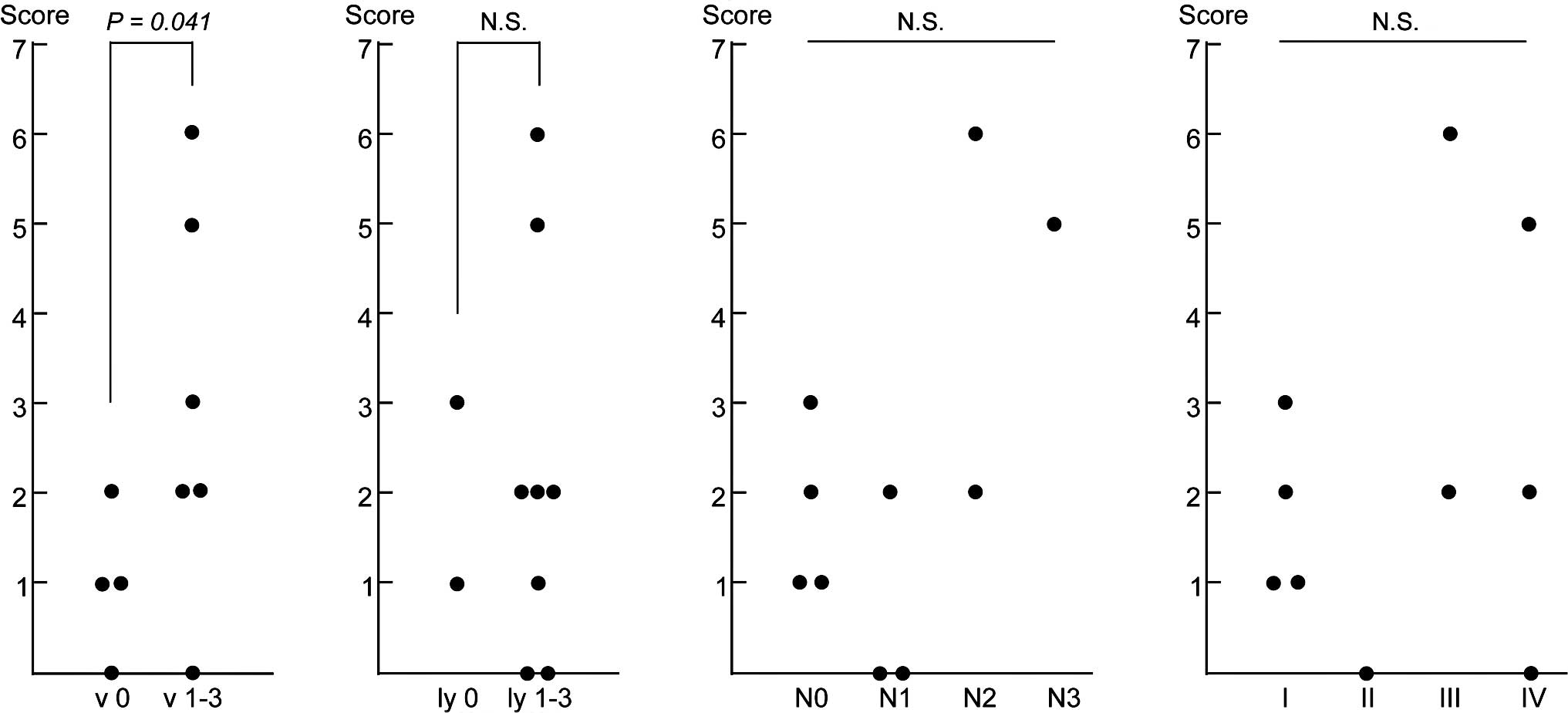 We further investigated the association of the expression of the nine candidate marker genes with clinicopathological parameters of the 10 cases. We focused on four parameters: vascular invasion (v factor), lymphatic invasion (ly factor), lymph node metastasis (N factor) and pathological stage I–IV, and investigated the association of these parameters with the total number of positive genes in the PBMCs of each patient (Fig. 1). Of the four parameters, the numbers of genes expressed in the PBMCs were ≤2 in all of the vascular invasion-negative cases (v 0), while the numbers of genes were ≥2 in 5 of 6 positive cases (v 1–3), exhibiting a significant difference between the two groups (P=0.041; Fig. 1A). However, no significant association was observed for the other three parameters (Fig. 1B–D), suggesting that the combined expression analysis of the nine marker genes using PBMCs detected micrometastasis through vascular invasion in the primary gastric cancer tissues.