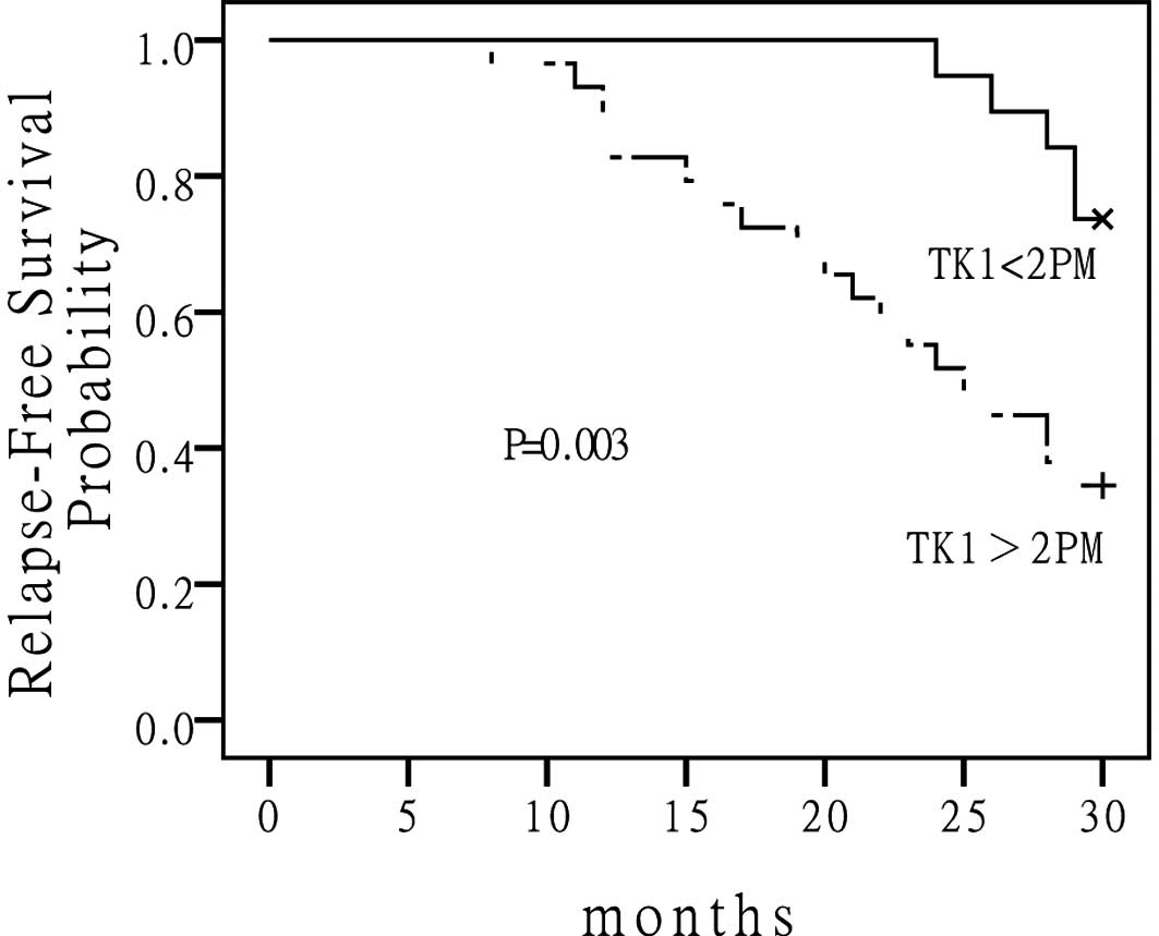 Thymidine kinase (TK) is an enzyme in the pyrimidine salvage pathway and catalyzes the phosphorylation of thymidine monophosphate (12). There are two forms of TK: A cytosolic (TK1) and a mitochondrial form (TK2) (13). The level of TK1 is very low in non-proliferating cells but increases dramatically at late G1 to late S-phase/early G2 phase during the cell cycle in proliferating cells and tumor cells. This makes TK1 a noteworthy marker for cell proliferation and tumor growth. In patients with malignancies, >95% of the TK1 activity in serum (S-TK1) is derived from malignant cells (14). Thus, S-TK1 should be a good marker for tumor cell proliferation. S-TK1 activity has been used to monitor the extent of tumor metastasis and prognosis in patients with acute leukemia, chronic leukemia, Hodgkin’s and non-Hodgkin’s disease, bladder carcinoma, and cervical carcinoma (15–21). Yet, no study to date has examined the significance of S-TK1 as a prognostic indicator for LABC patients who have undergone neoadjuvant chemotherapy. Therefore, we sought to determine whether a high S-TK1 level in cancer specimens retrieved from LABC patients receiving neoadjuvant chemotherapy is an independent predictor of poor outcome.