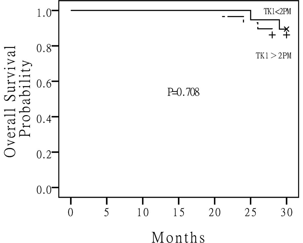 Note that patients who had elevated S-TK1 levels in their serum had a higher rate of recurrence and cancer-related death when compared to those who had low S-TK1 levels. The 5-year DFS for the low S-TK1 group versus the high S-TK1 group were 56 and 21%, respectively (P=0.003) (Fig. 2). The median DFS had not been reached for the low S-TK1 group and was 23 months for the high S-TK1 group. The median OS for the low S-TK1 group and high S-TK1 group had not been reached (Fig. 3). There were no statistically significant differences between the two groups. Although a high S-TK1 concentration appeared to be predictive of outcome, we assessed whether S-TK1 was a covariant of nodal status. In other words, was a high S-TK1 level a surrogate marker of advanced nodal disease? There was no statistical correlation between the two variables (P= 0.11), thus confirming that a high S-TK1 concentration was not a covariant of nodal status. Next, we evaluated whether a high S-TK1 concentration was correlated with any known clinicopathological factors such as tumor size, nodal status, estrogen and progesterone receptor status, and HER-2 receptor status. There were no correlations between the degree of S-TK1 concentration with tumor size (P=0.15), nodal status (P=0.11), ER status (P=0.63), PR status (P=0.45), or HER-2 status (P=0.89), thus suggesting that the S-TK1 concentration is an independent predictor of outcome.